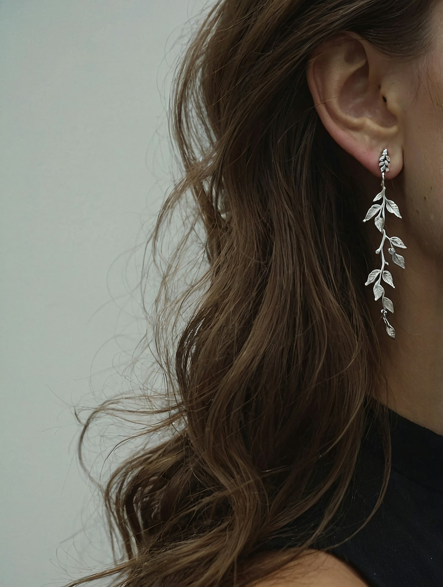 Close-up of a woman's ear with a silver vine leaf earring and wavy brown hair, set against a neutral background.