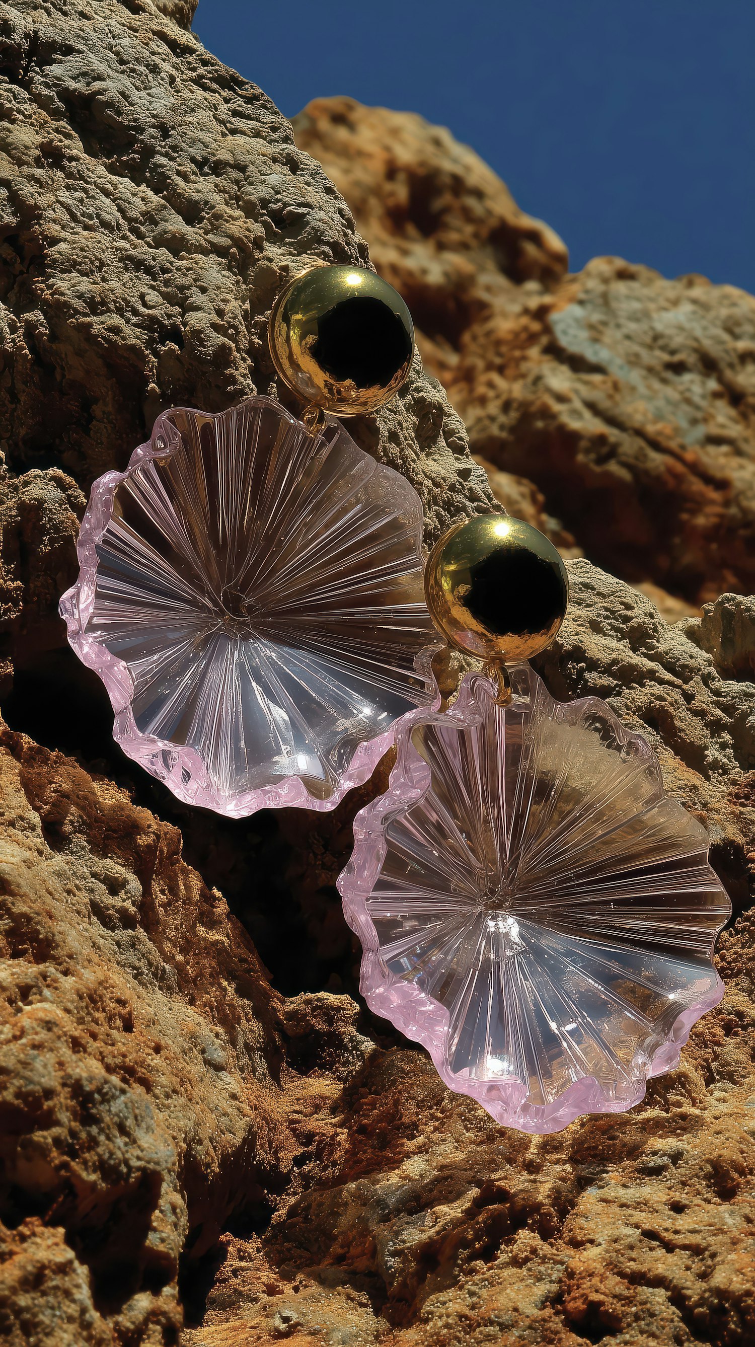 Elegant gold and pink earrings with a fan-shaped design, displayed on rugged rocks under a bright blue sky for a striking contrast.