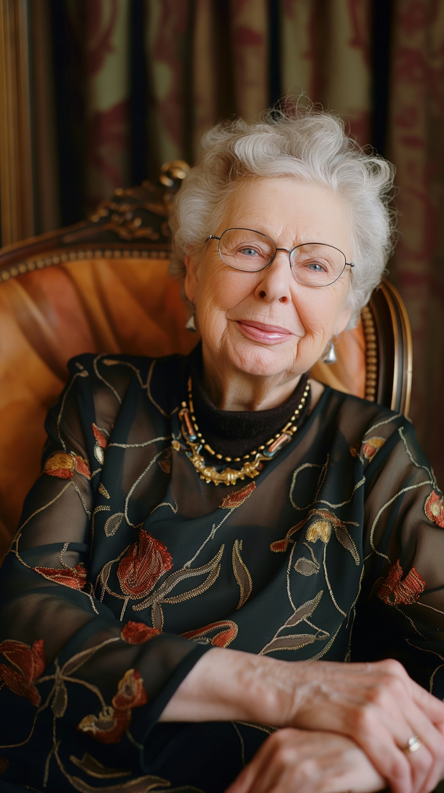 Elegant elderly woman with white hair and glasses, wearing a floral embroidered top and necklace, seated in an ornate chair.