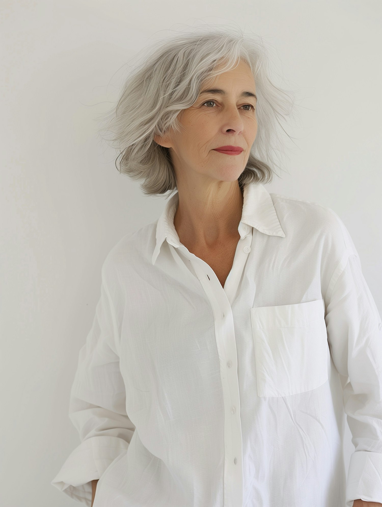 Elegant mature woman with gray hair in a white shirt, exuding calm and sophistication against a minimalist white background.