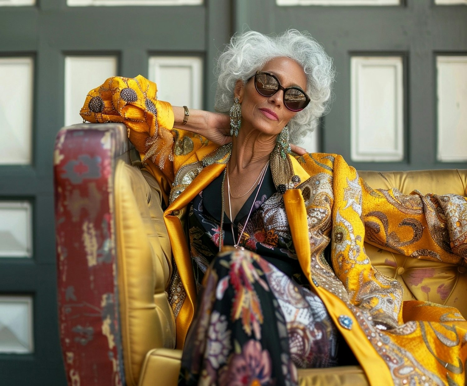 Elegant older woman in vibrant yellow coat and sunglasses, sitting confidently on a luxurious couch with a stylish, sophisticated look.