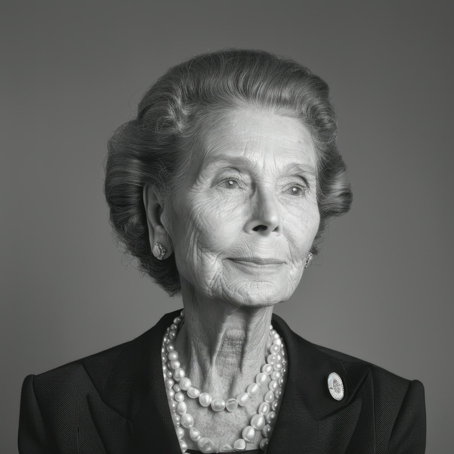 Elegant elderly woman with pearl jewelry and a serene expression, wearing a dark suit against a neutral background.