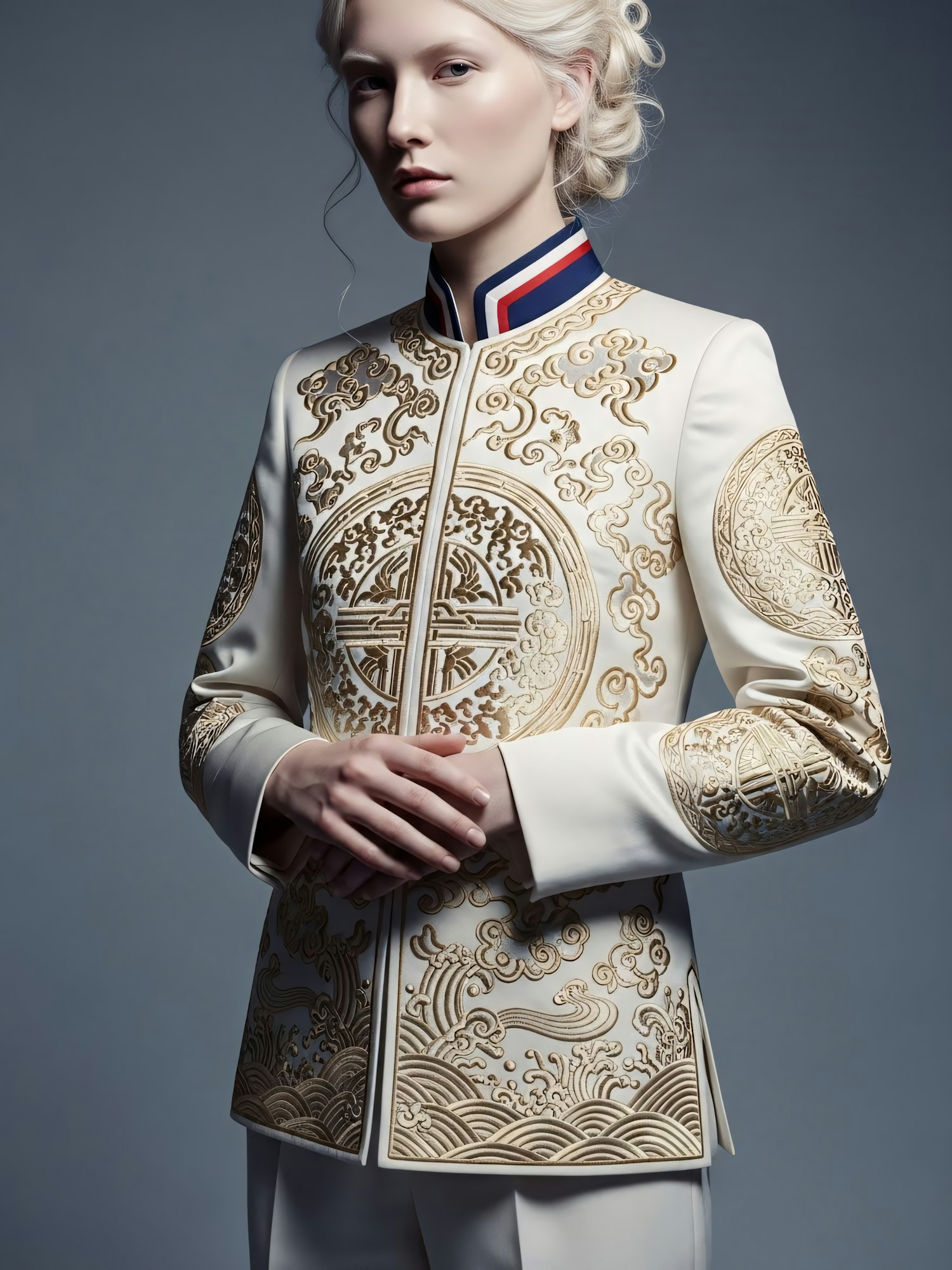 A person in a white jacket with intricate gold embroidery and a high collar stands against a gray background, exuding elegance and sophistication.