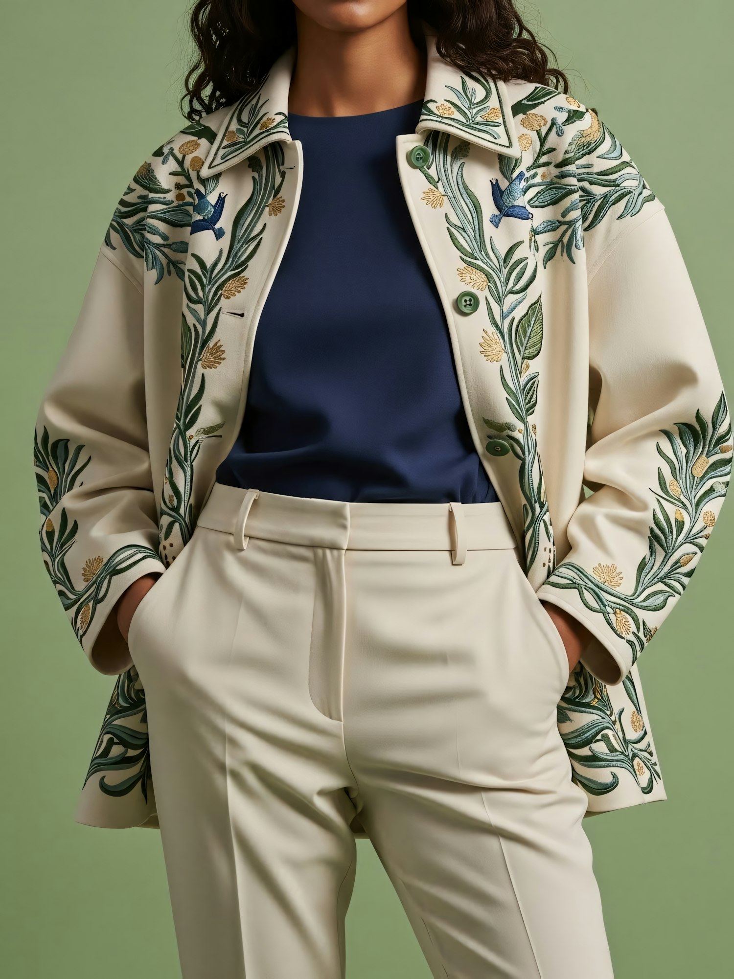 Elegant cream jacket with floral embroidery paired with matching trousers and a navy top, set against a muted green background.