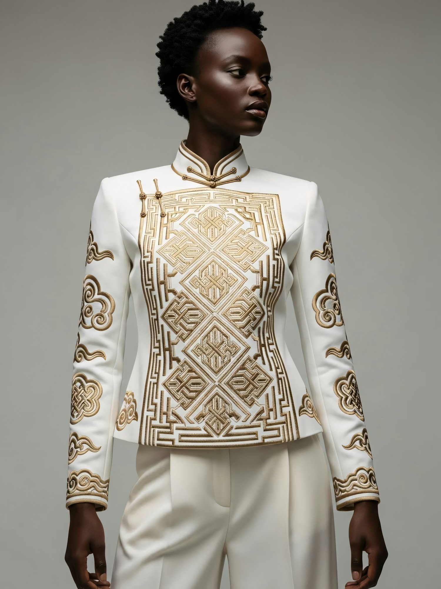 A person in a white and gold embroidered outfit, showcasing intricate patterns and a formal, elegant style against a neutral background.