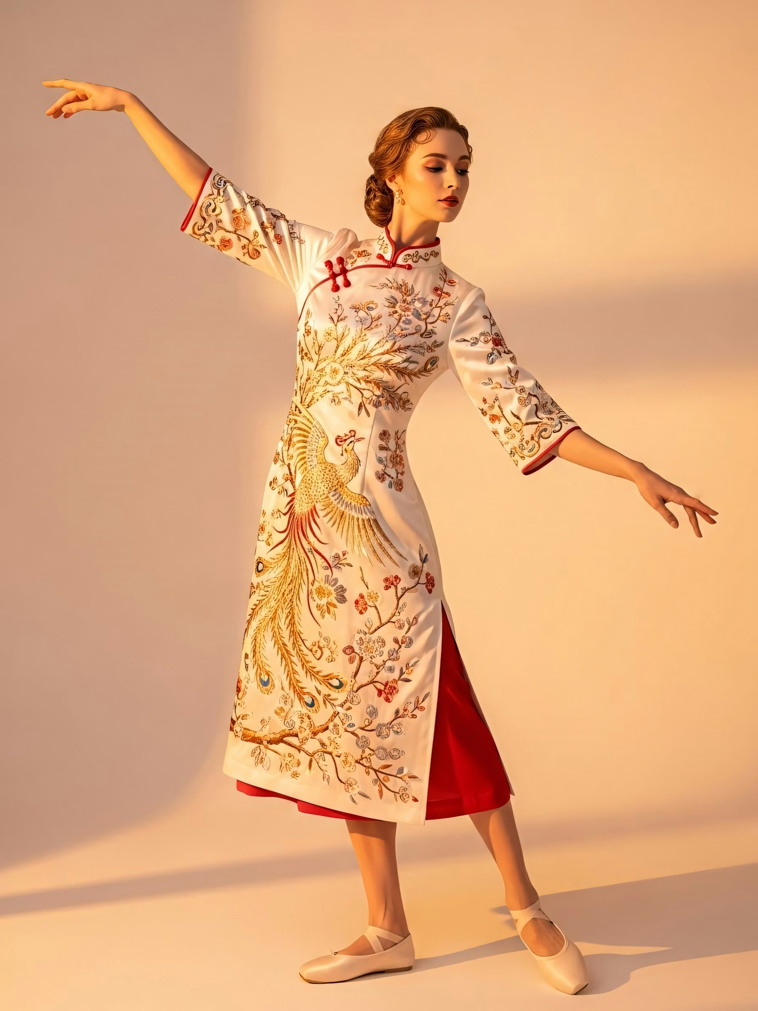 A woman in a traditional embroidered dress poses gracefully, showcasing intricate patterns and elegant styling in warm lighting.