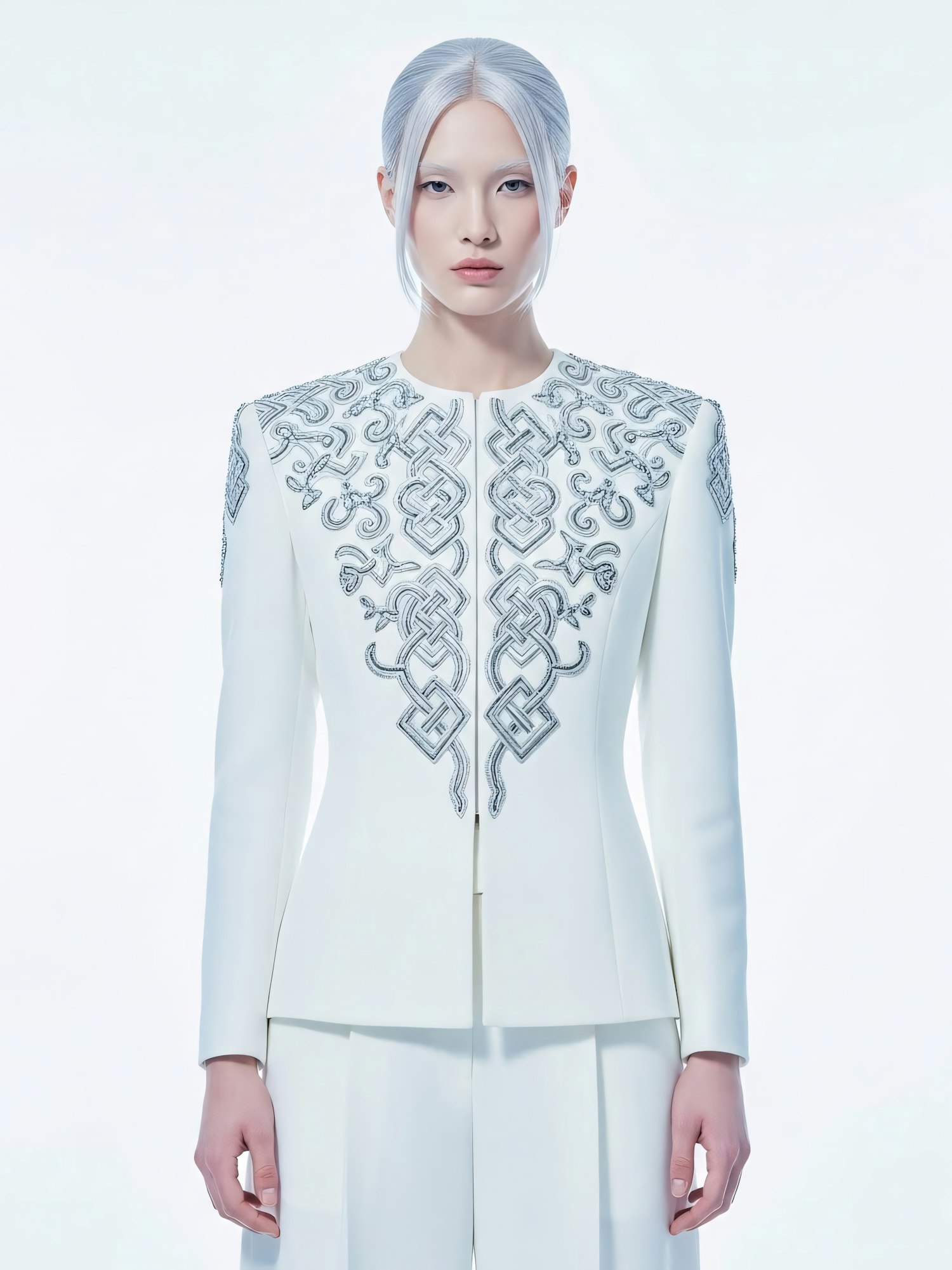 A person in a white outfit with intricate silver embroidery stands against a light background, showcasing elegance and detailed craftsmanship.