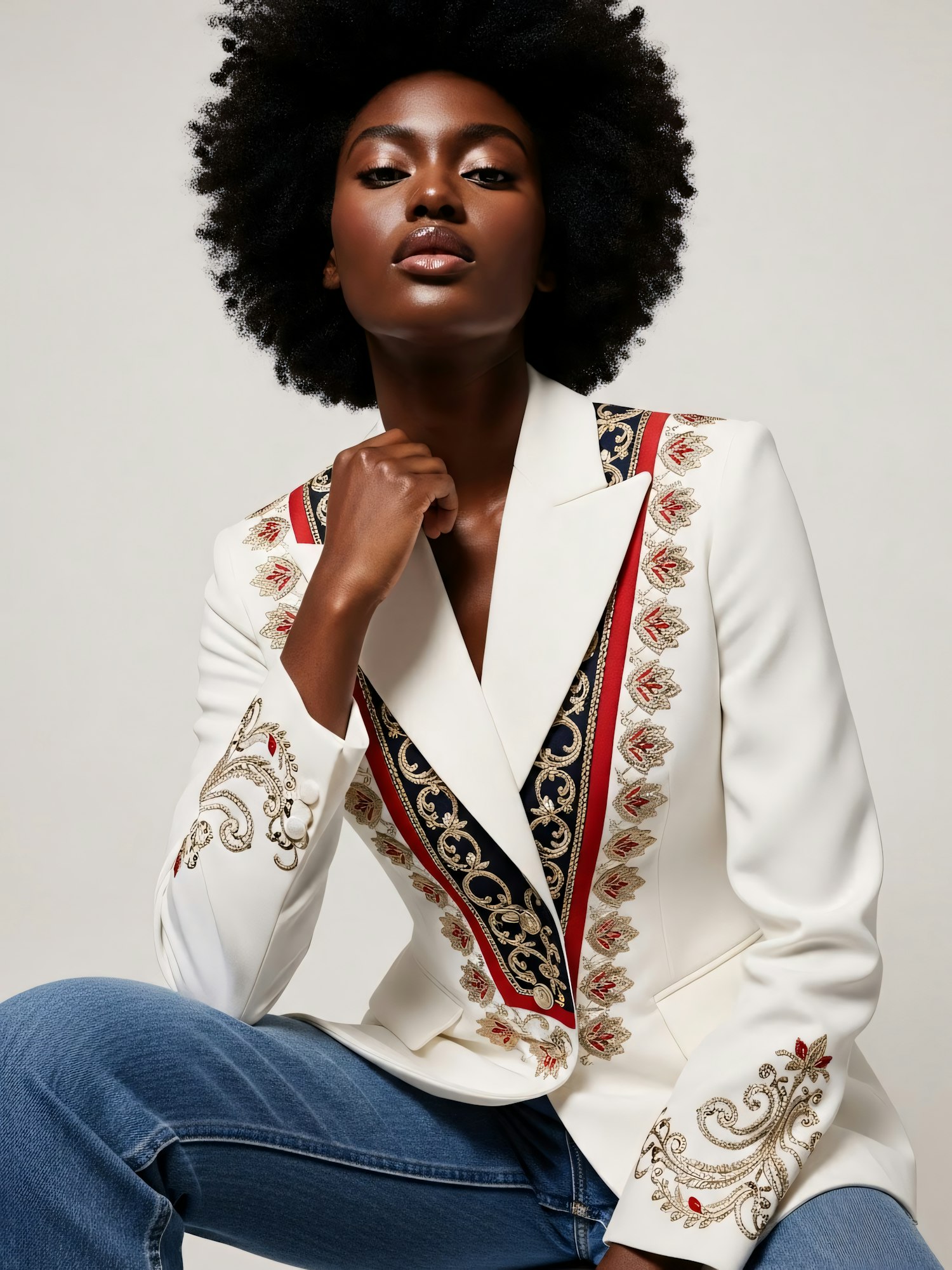 Stylish individual in a white embroidered blazer and jeans, showcasing a modern and elegant fashion statement.