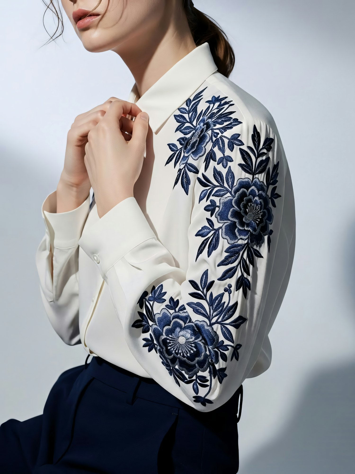 Elegant white blouse with blue floral embroidery paired with navy trousers, showcasing intricate design and sophisticated style.