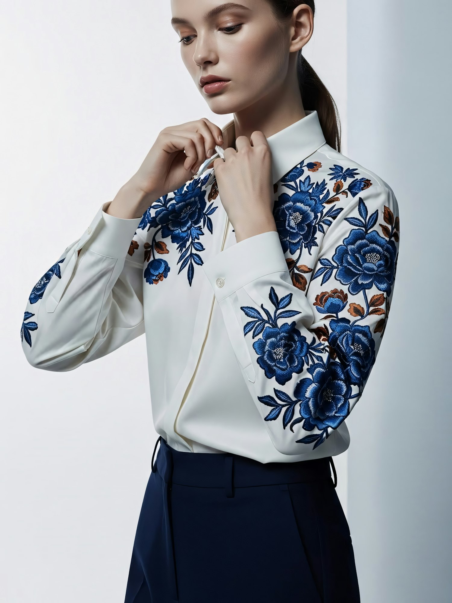 A woman in a white blouse with blue floral embroidery adjusts her collar, paired with navy trousers, against a minimalistic background.