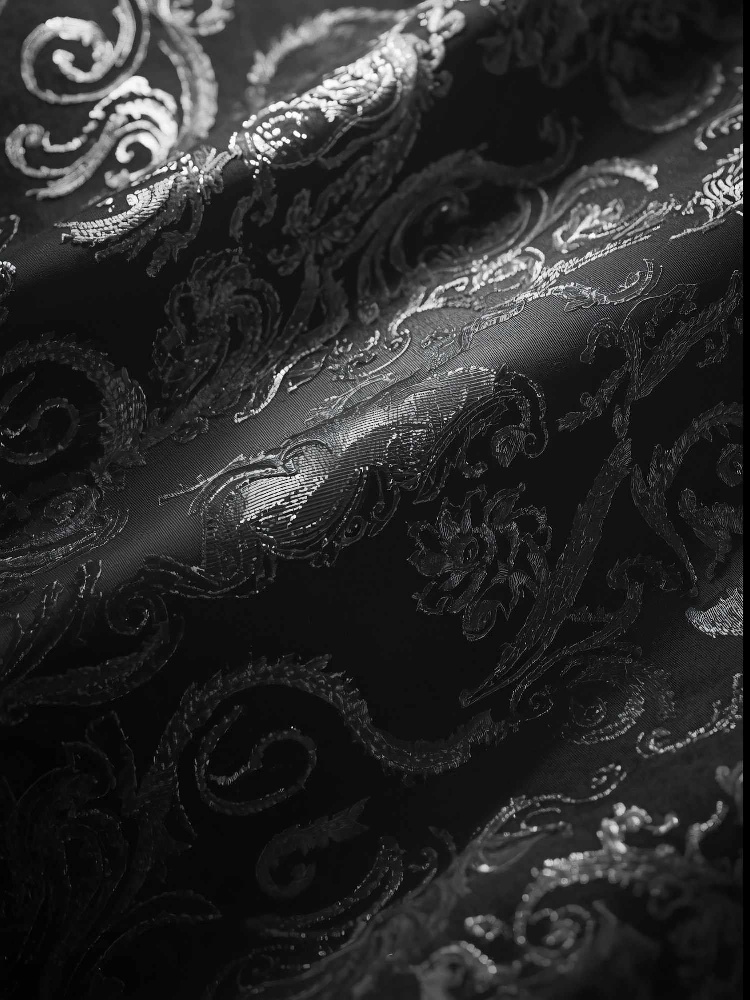 Luxurious black fabric with intricate silver embroidery, featuring ornate floral and swirling patterns, highlighted by shimmering light.