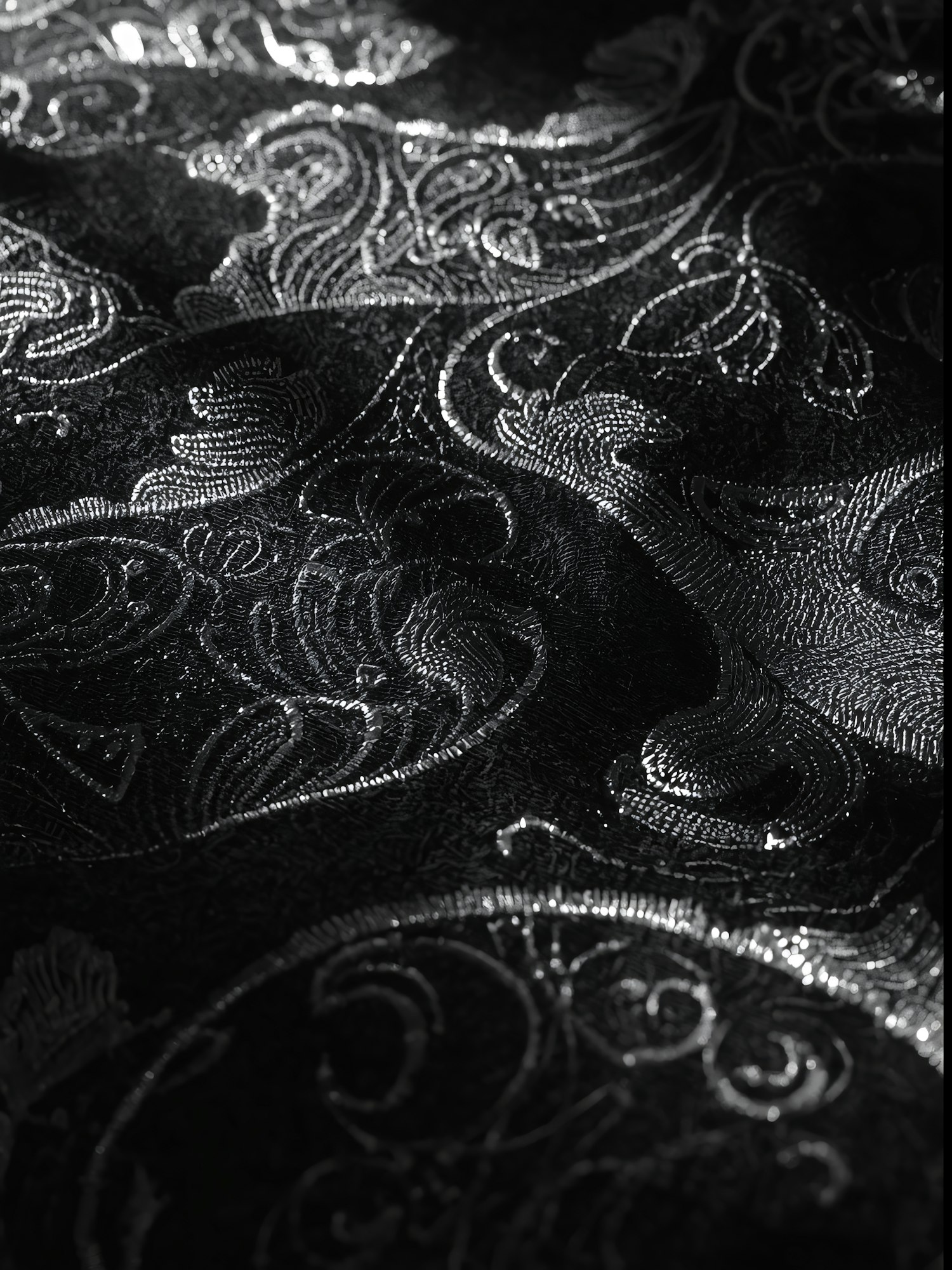 Close-up of black fabric with intricate silver embroidery, showcasing elegant swirling patterns and shimmering details.