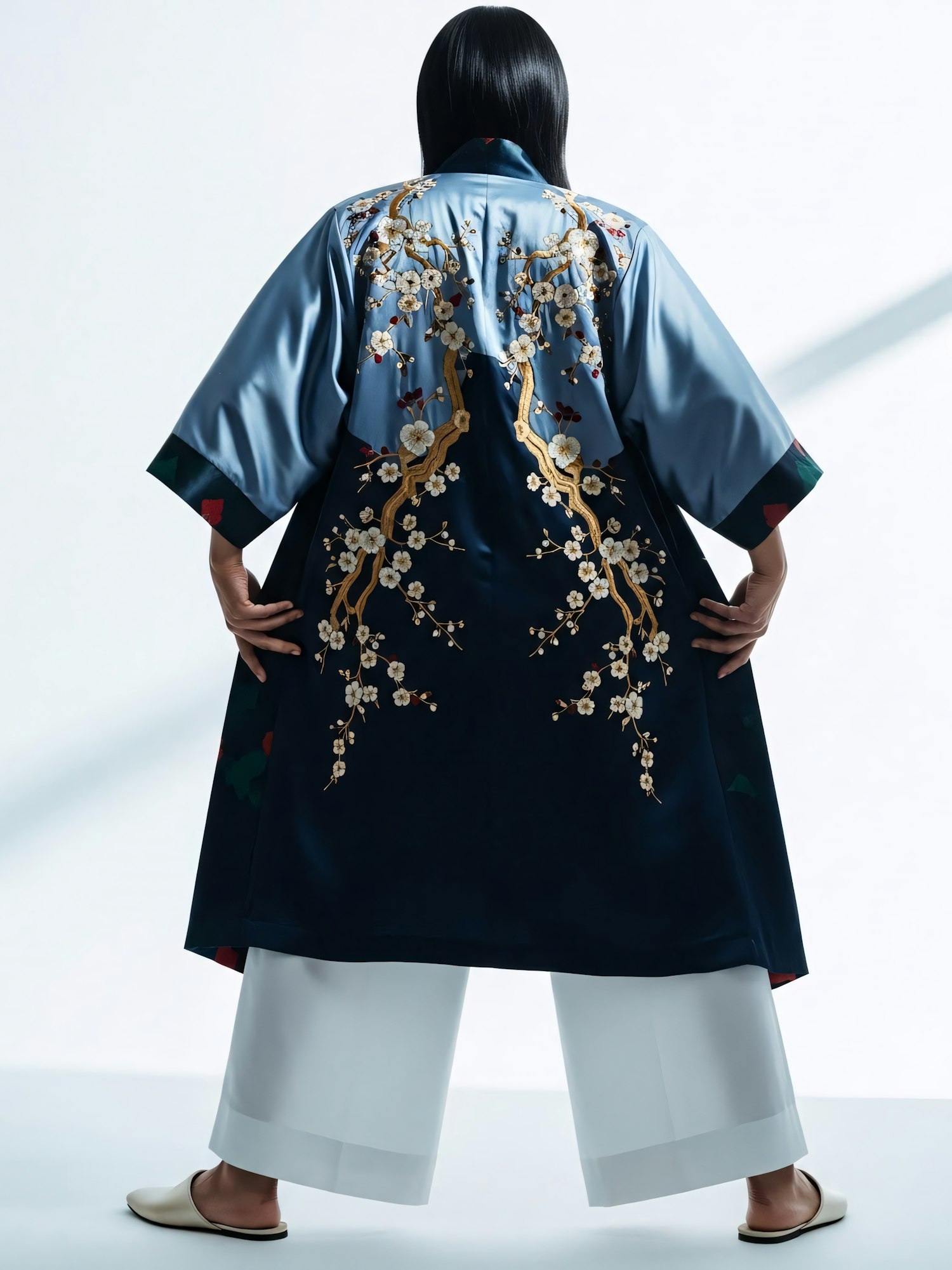 A person in a dark blue embroidered robe with floral patterns, paired with white pants, stands against a minimalistic background.
