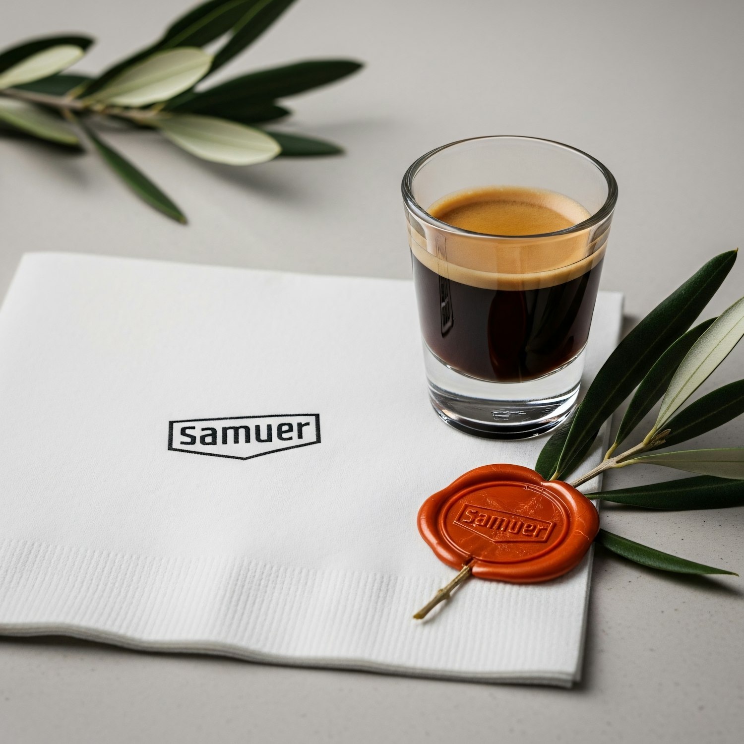 A stylish espresso setup with a branded napkin, wax seal, and olive leaves on a clean, minimalistic background.