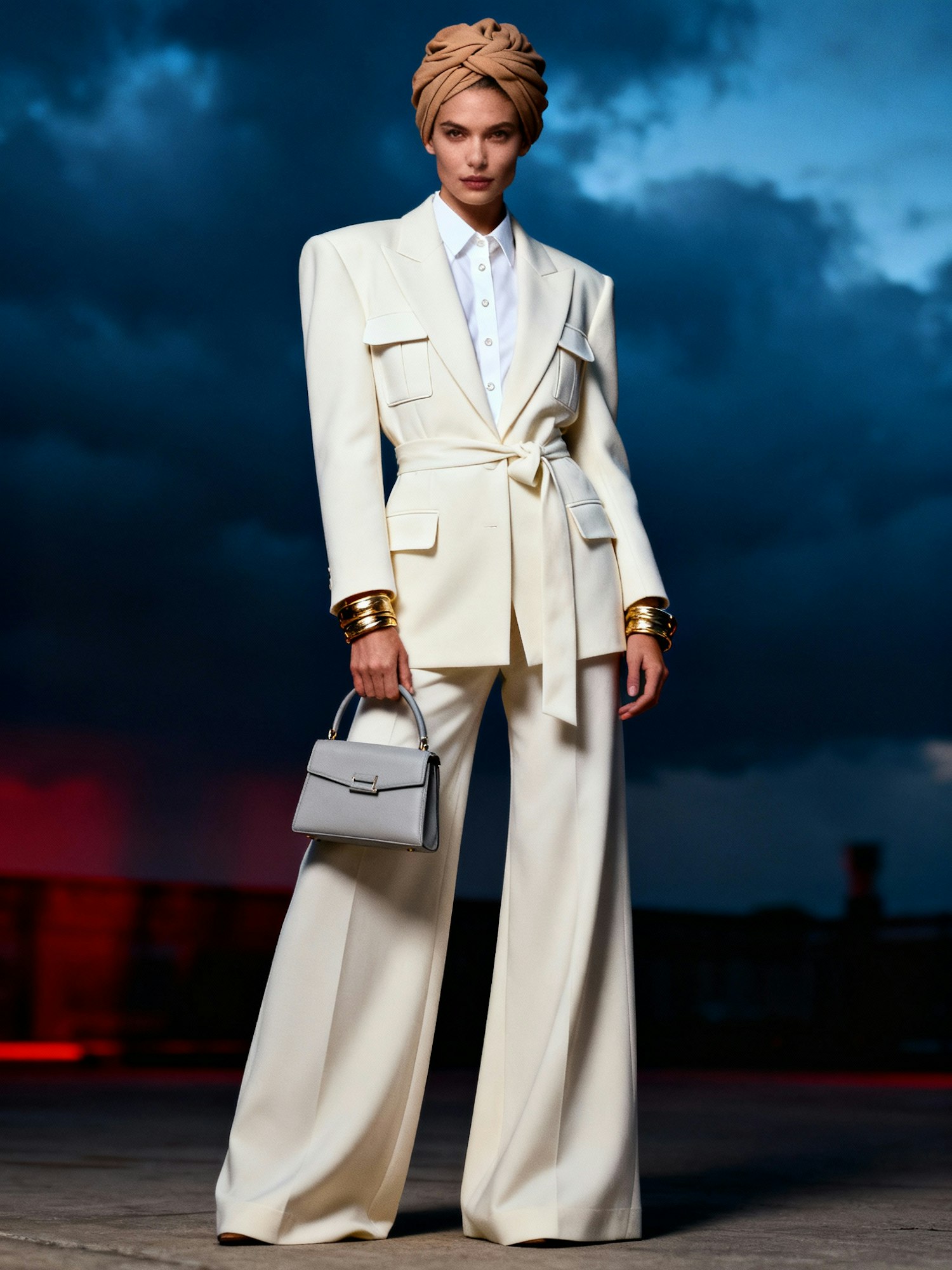 Full-body professional portrait of a woman wearing a modern, high-fashion cream or ivory tailored pantsuit with an oversized, relaxed-fit blazer featuring flapped pockets and a tie-waist detail, paired with extra-wide-leg palazzo trousers that skim the floor. She has a crisp white button-down shirt underneath the blazer. Her head is adorned with a stylishly wrapped jersey scarf in a tan or light brown color. She wears chunky gold cuff bracelets and holds a small, structured top-handle bag in light gray. The pose is confident and poised. The image should feature dramatic moody lighting with stormy dark blues, a cool color palette, and warm highlights, with a soft background blur that includes subtle red tones. A prominent shadow is cast behind her at 29 degrees. The style is cinematic 35mm film, high-definition, and sharp, with soft blue hues, exuding a sophisticated and high-fashion vibe."keeping her original facial features