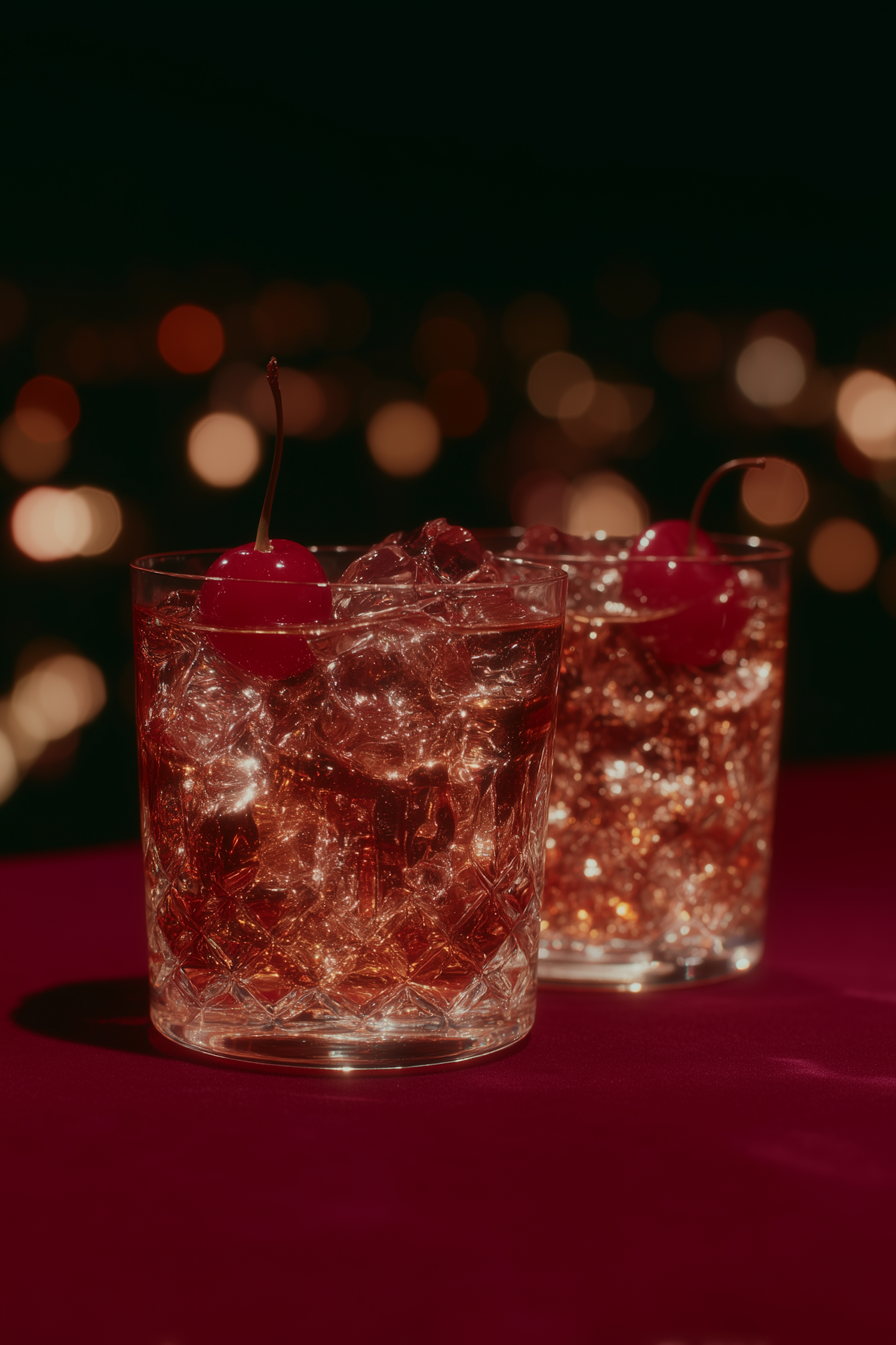 Two crystal glasses with a golden drink and cherries on a red table, set against a dark background with warm, blurred lights.