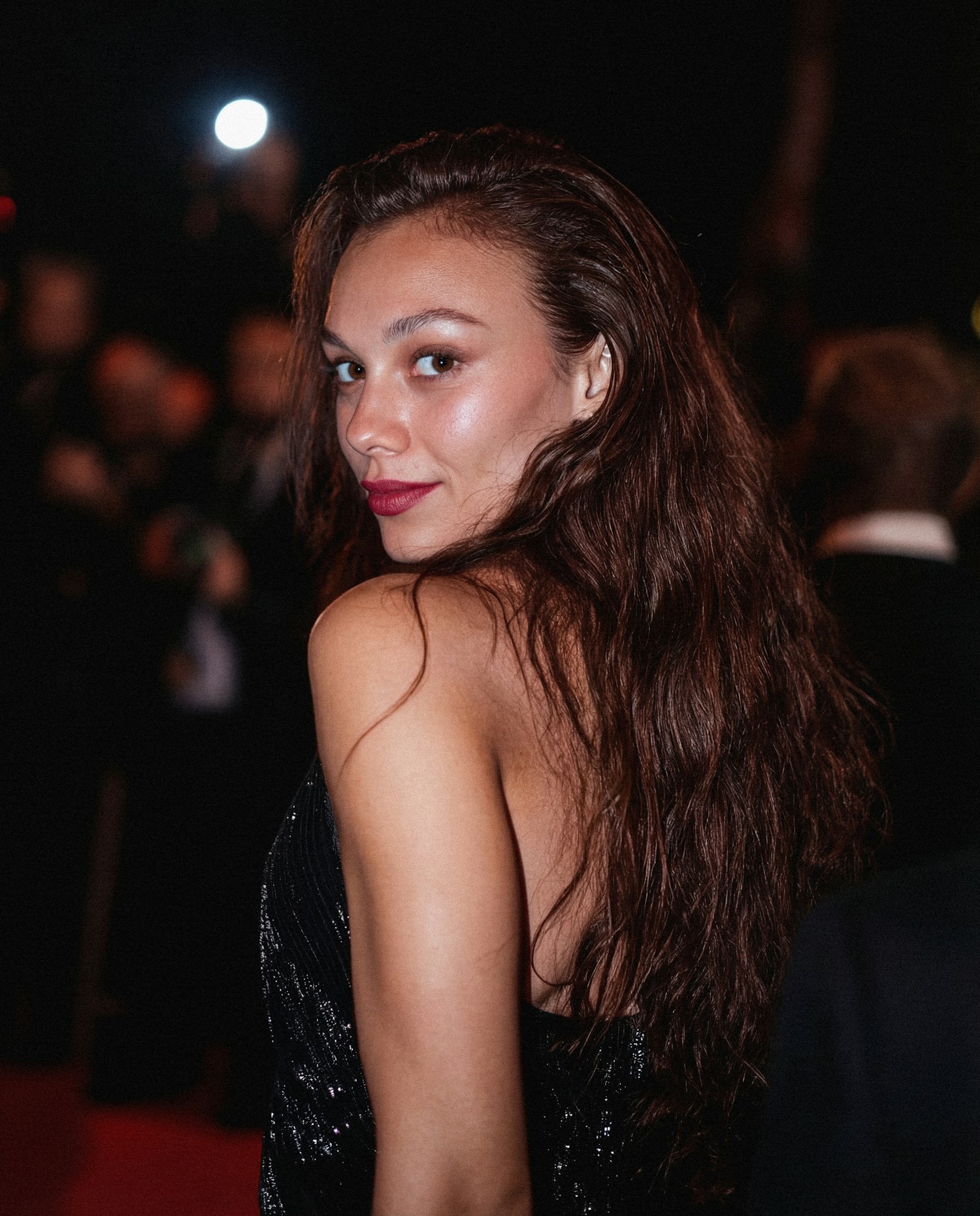 A woman with long brown hair in a black dress at a formal event, looking over her shoulder with a confident expression.