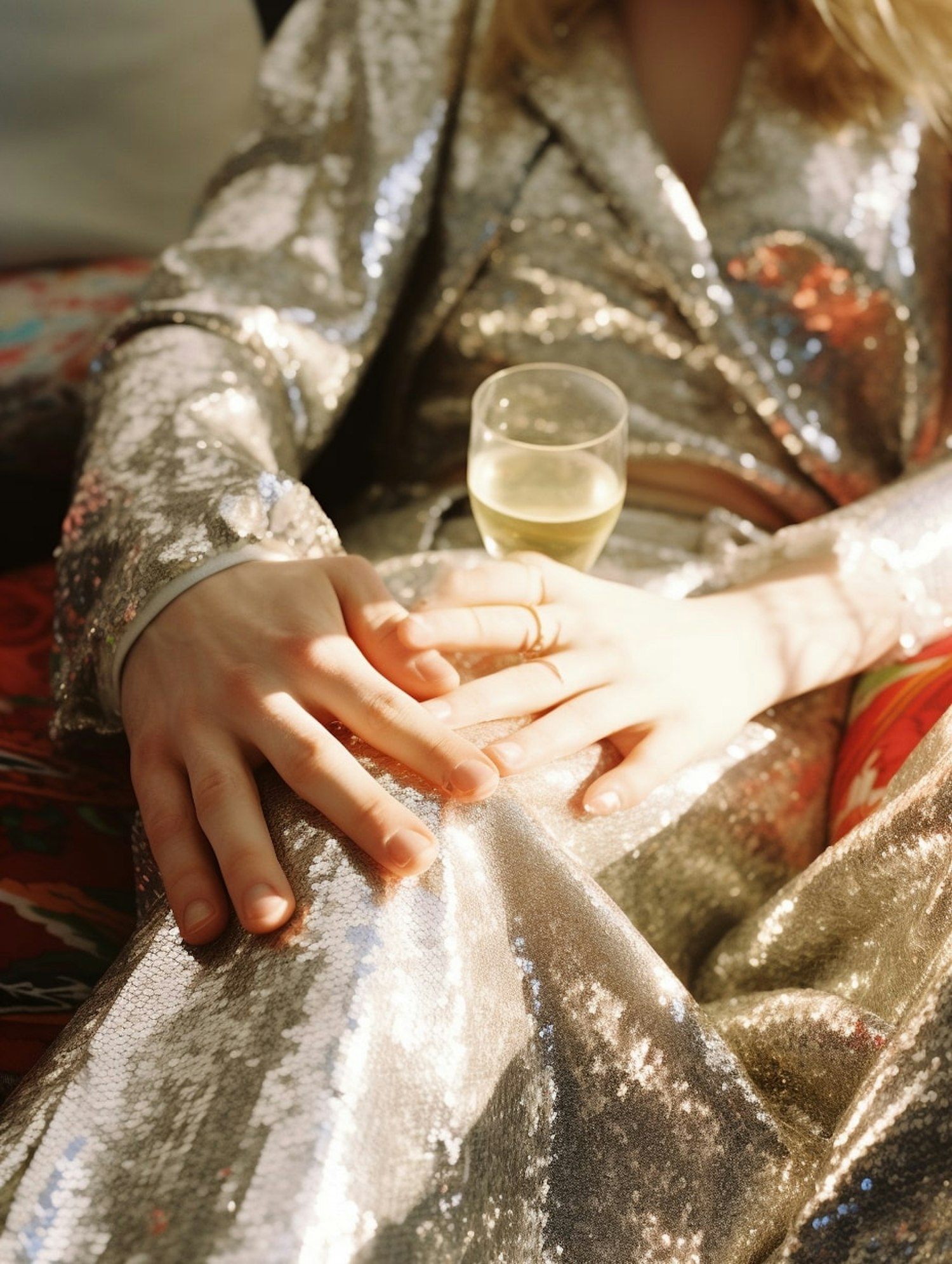 Elegant scene with a person in a shimmering sequined outfit holding a glass of white wine, exuding luxury and relaxation.