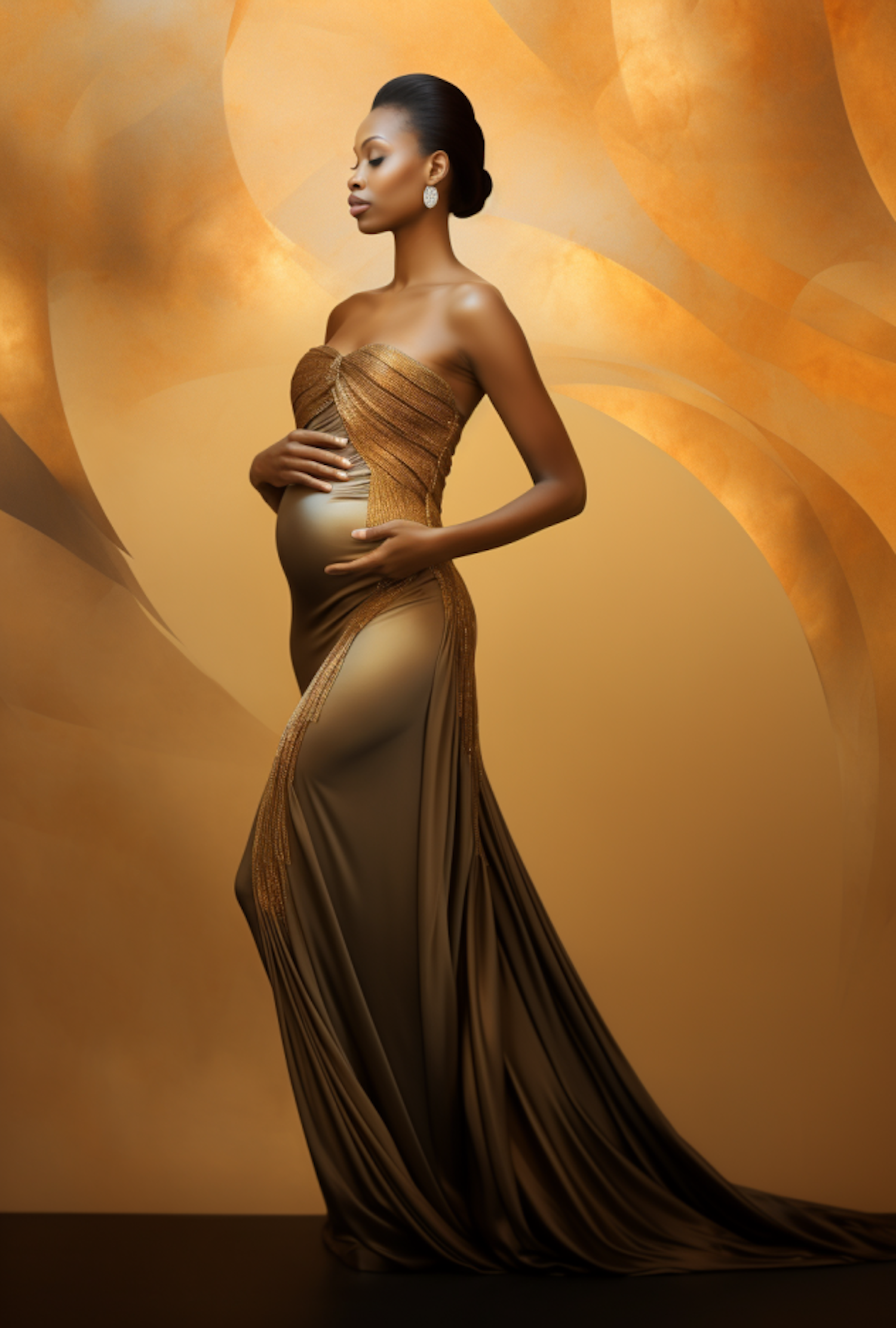 Elegant pregnant woman in a shimmering gold gown, cradling her belly against a warm, abstract background.