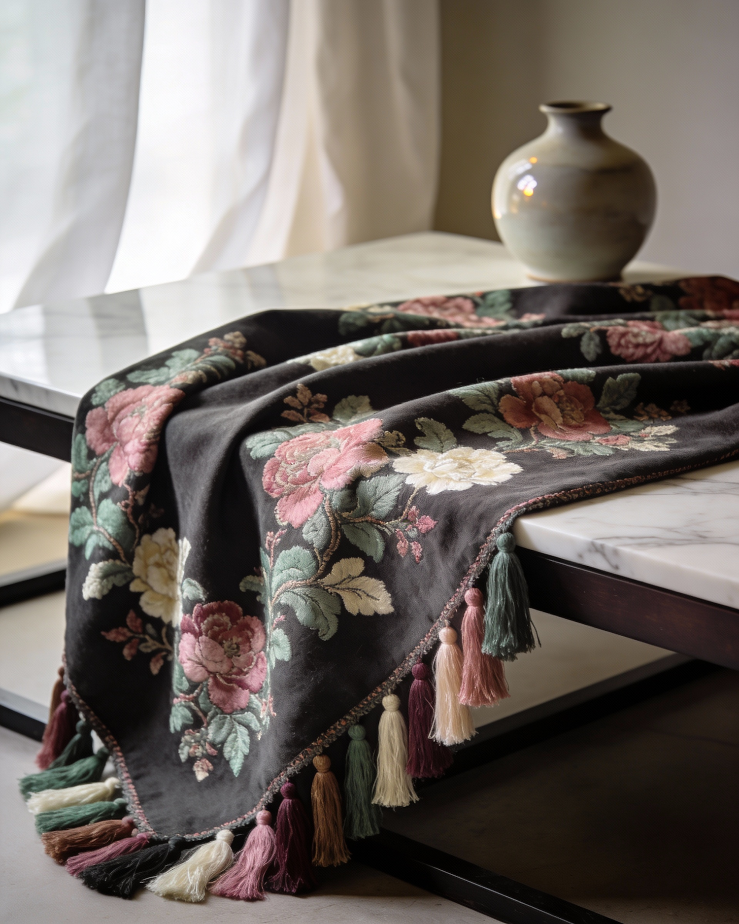A charcoal base textile with ornate floral patterns in dusty rose, sage, and cream is laid across a low marble table. The fringe is replaced with tassels in alternating tones. The background features a soft curtain and a ceramic vessel, blending classical and contemporary moods.