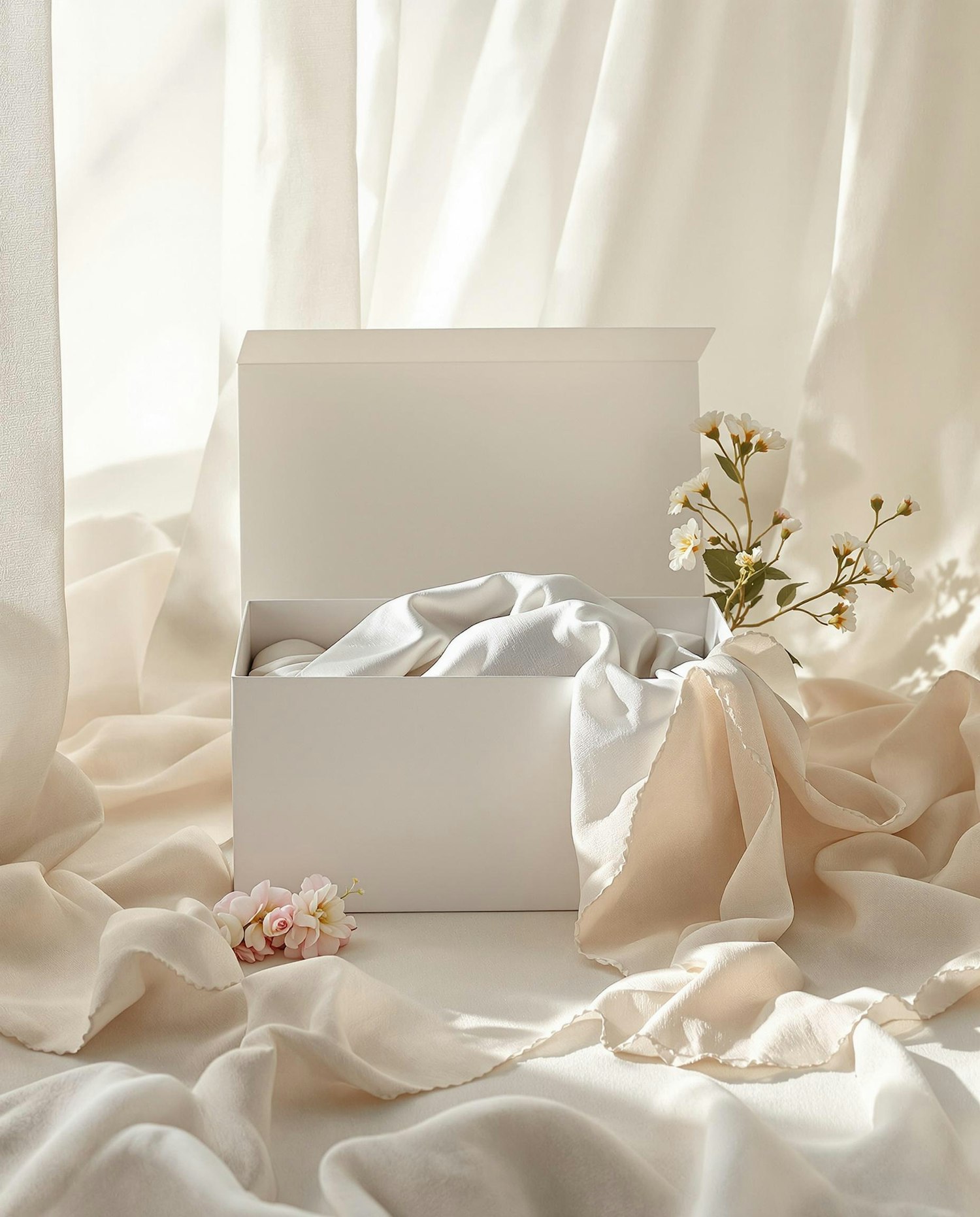 Elegant white box with soft fabric and delicate flowers, surrounded by flowing beige drapery in warm natural light.