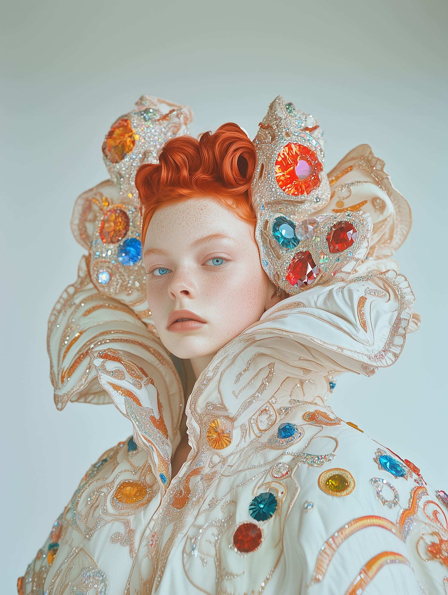 Portrait of a red-haired woman in a regal, gemstone-adorned outfit with intricate embroidery, exuding elegance and futuristic style.