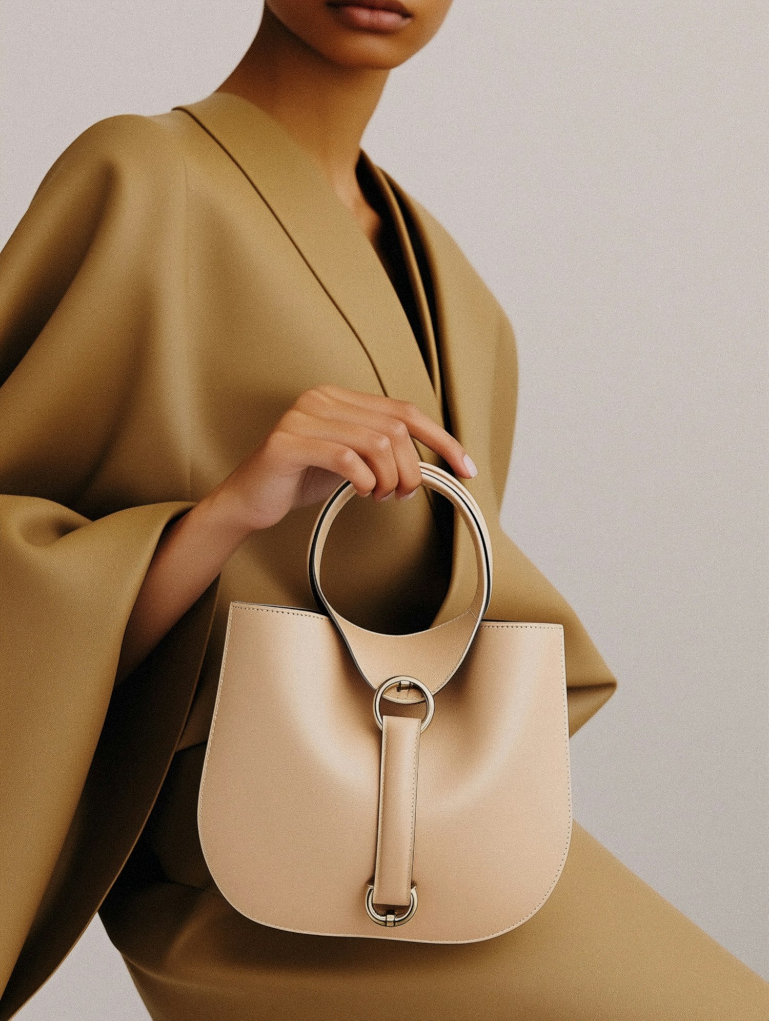 Elegant woman in tan attire holding a chic beige handbag with circular handle and metal accents, set against a muted gray background.