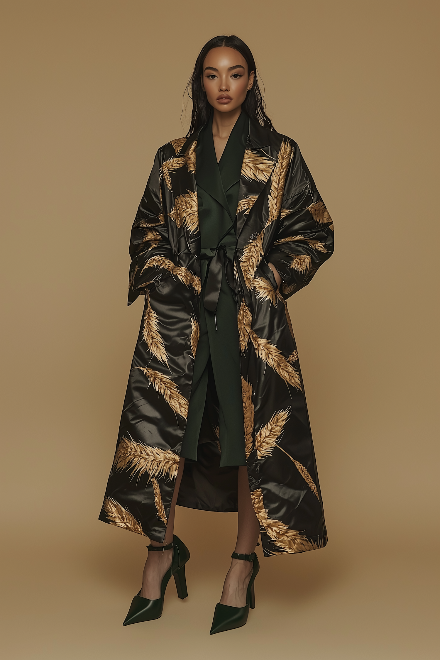 Elegant woman in a black coat with golden feathers, dark green outfit, and matching heels against a beige background.