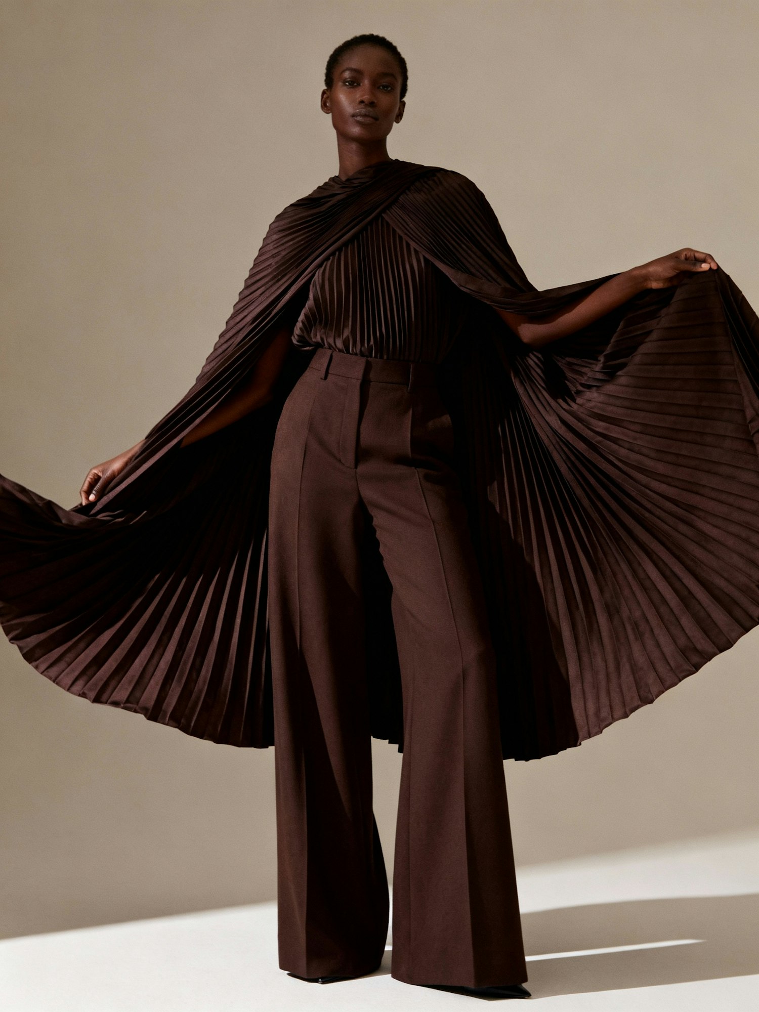 A person in a pleated brown cape and trousers stands confidently against a neutral background, showcasing elegant fashion and style.