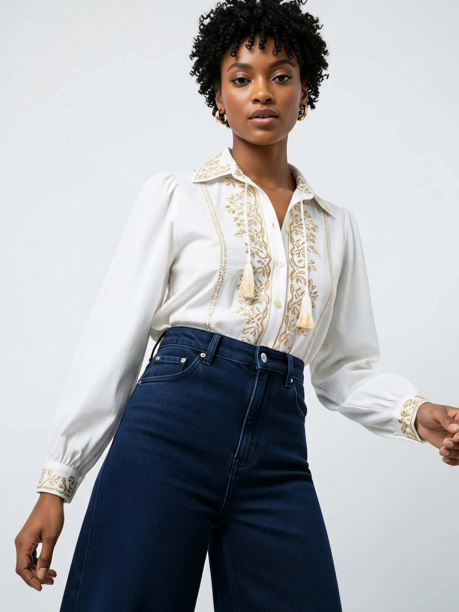 Stylish individual in a white embroidered blouse and dark blue jeans, accessorized with gold hoop earrings, against a plain background.