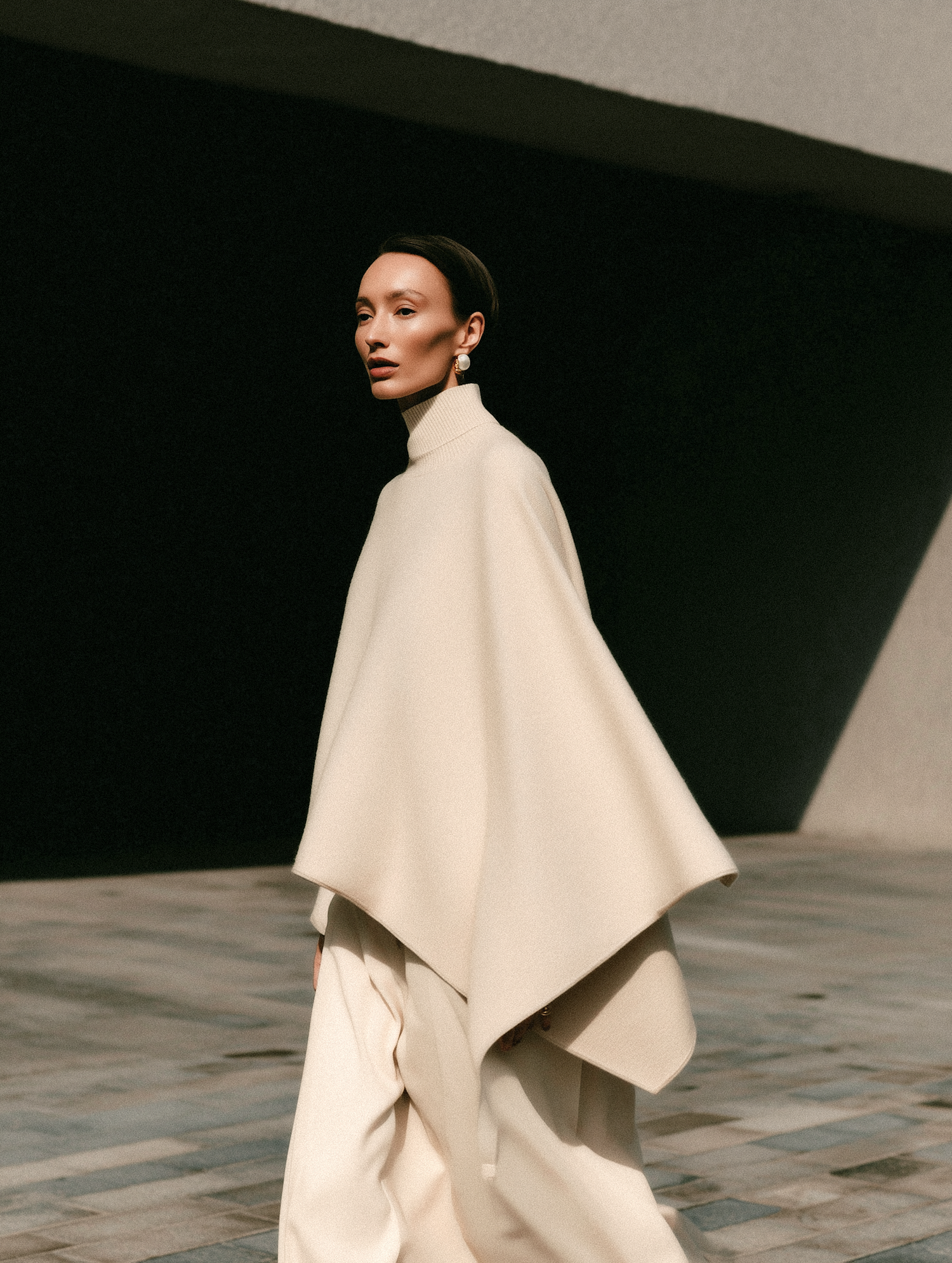 A stylish individual in a beige poncho and wide pants, standing against a modern architectural backdrop with dramatic lighting.
