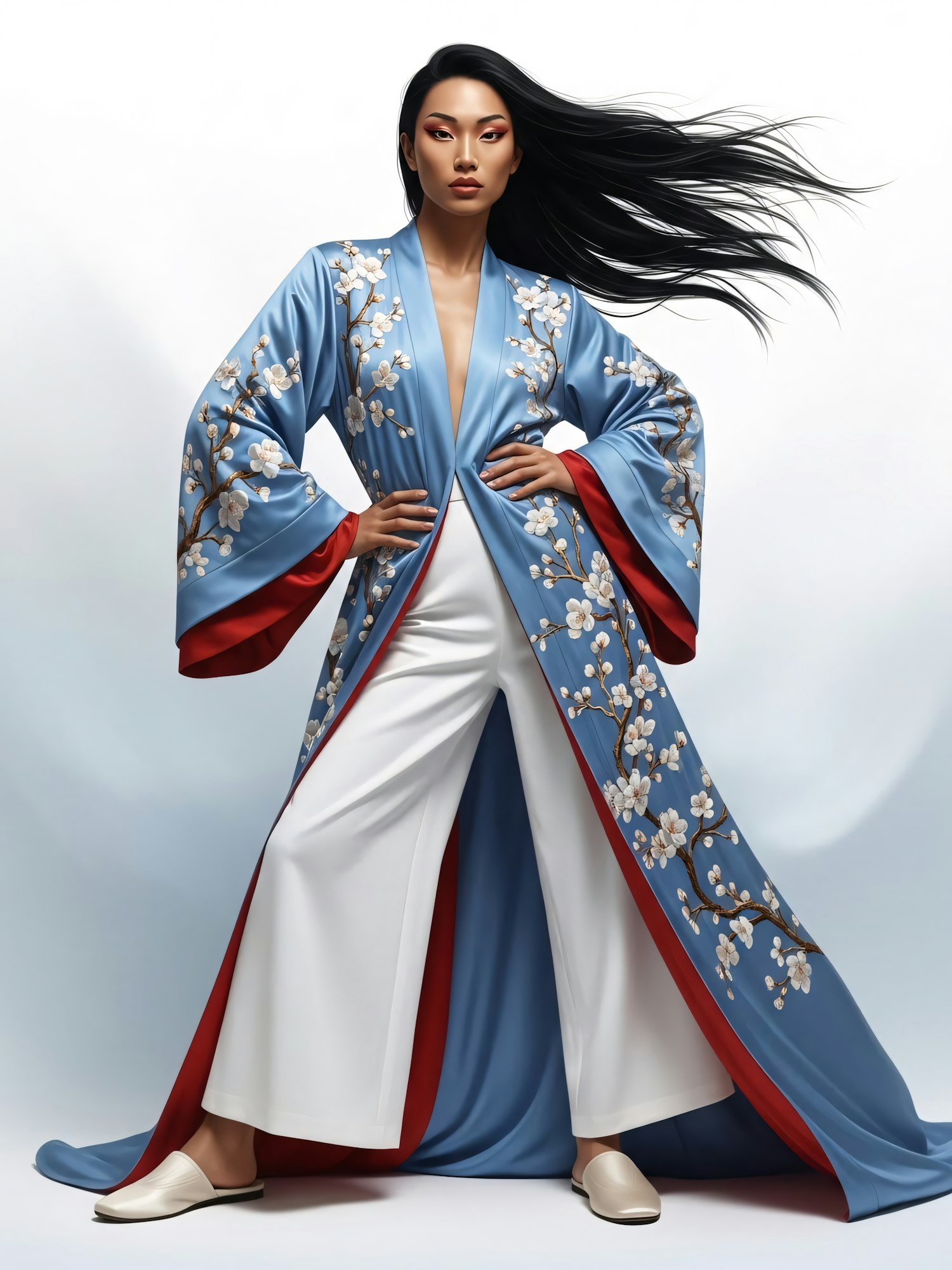 A stylish individual in a blue floral robe and white pants, exuding confidence and elegance against a minimalistic background.