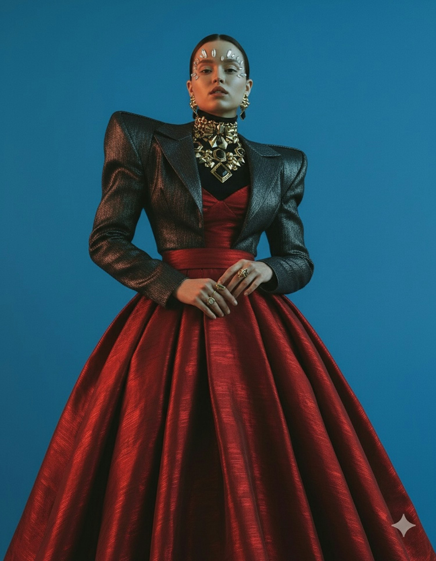 A bold fashion portrait featuring a person in a structured black jacket, red skirt, and gold accessories against a vivid blue background.