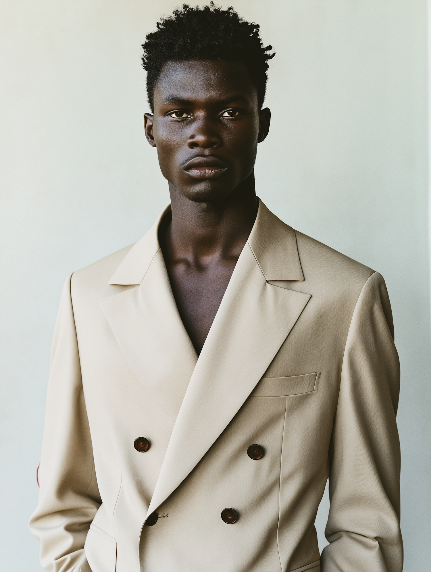 Stylish young man in a beige double-breasted suit, exuding elegance and confidence with a serious expression.