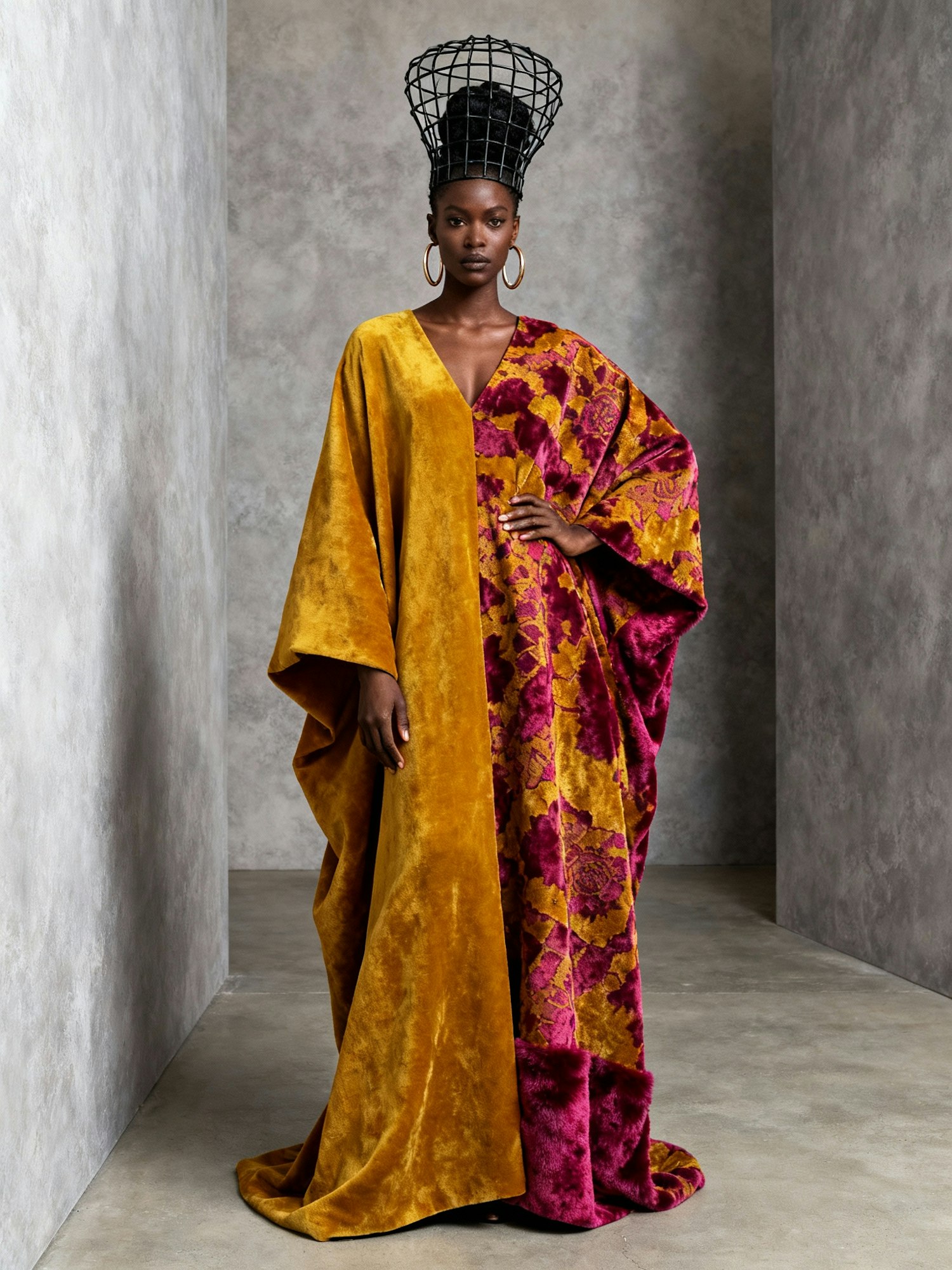 "Full-body professional portrait of a Black woman, a singular figure, radiating elegance and strength. She wears a voluminous, show-stopping high-fashion kaftan gown, making an undeniable statement. The kaftan features a striking two-color textile, with one color being a rich mustard yellow, paired with a complementary bold hue. Her hair is styled in a distinctive Sculptural, avant-garde hair cage, complementing her strong features. She accessorizes with striking large hoop earrings. Her pose is confident and poised, with a powerful, serious facial expression. The minimalist background features textured gray walls and a smooth concrete floor. Soft, even lighting meticulously highlights the rich textures and intricate patterns of her garment. The style is cinematic, high-definition, and sharply focused, exuding an avant-garde and artistic high-fashion vibe that emphasizes her bold presence and the sartorial statement of her attire."