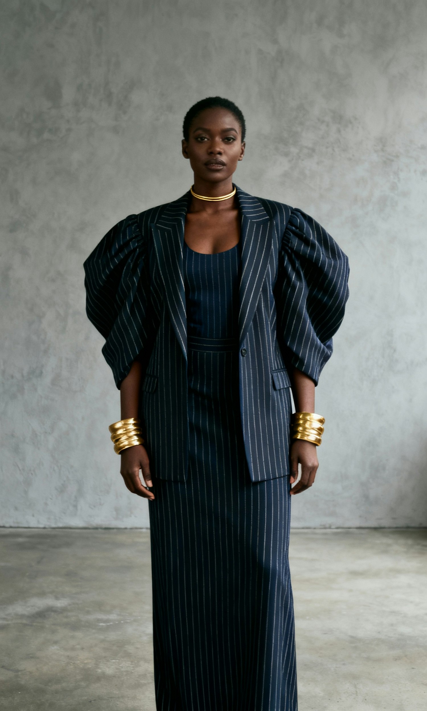 A person in a navy pinstripe outfit with bold sleeves and gold accessories stands against a minimalist gray background.