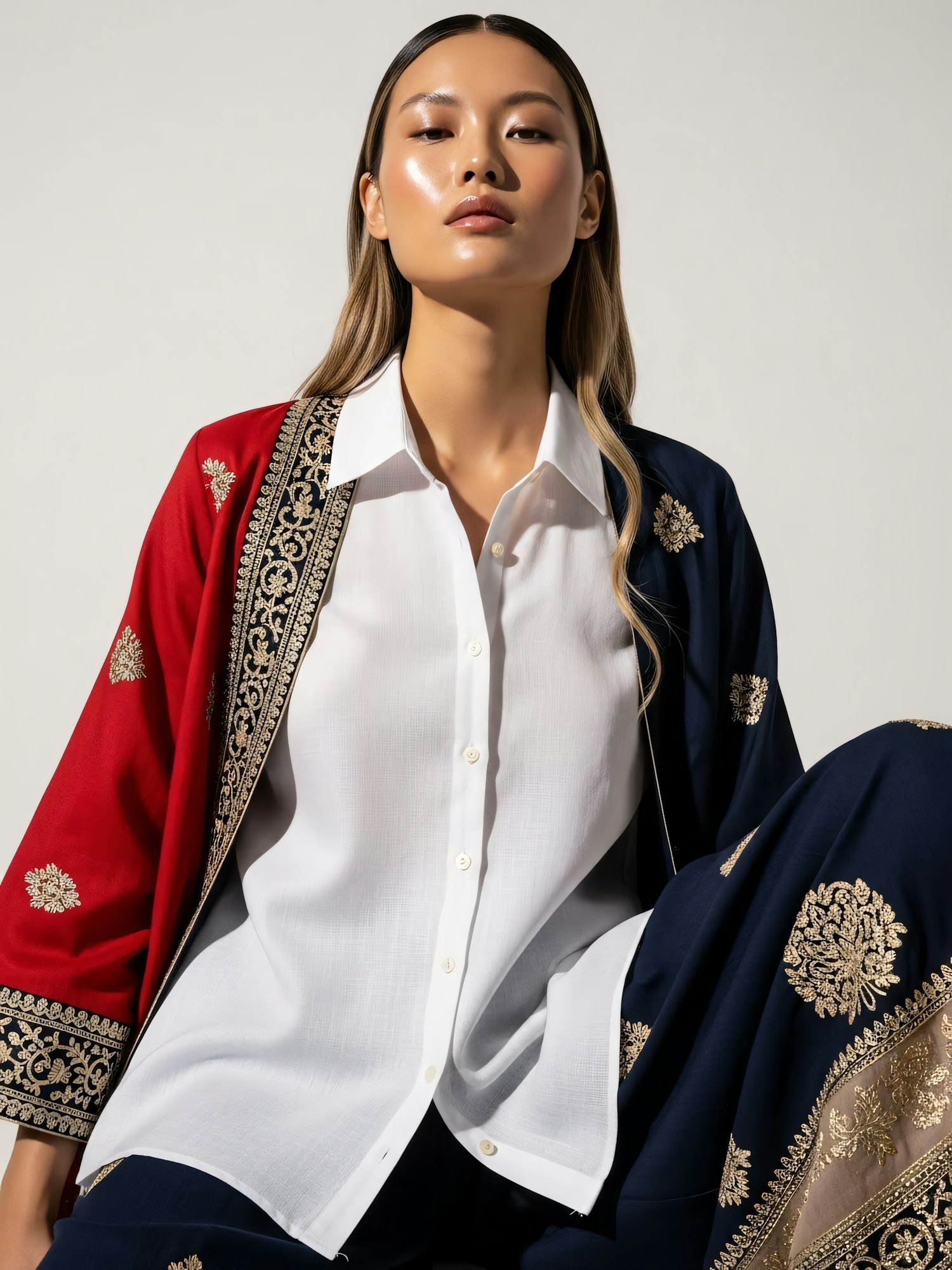 A stylish woman in a white shirt and embroidered red and navy outfit poses confidently against a neutral background.