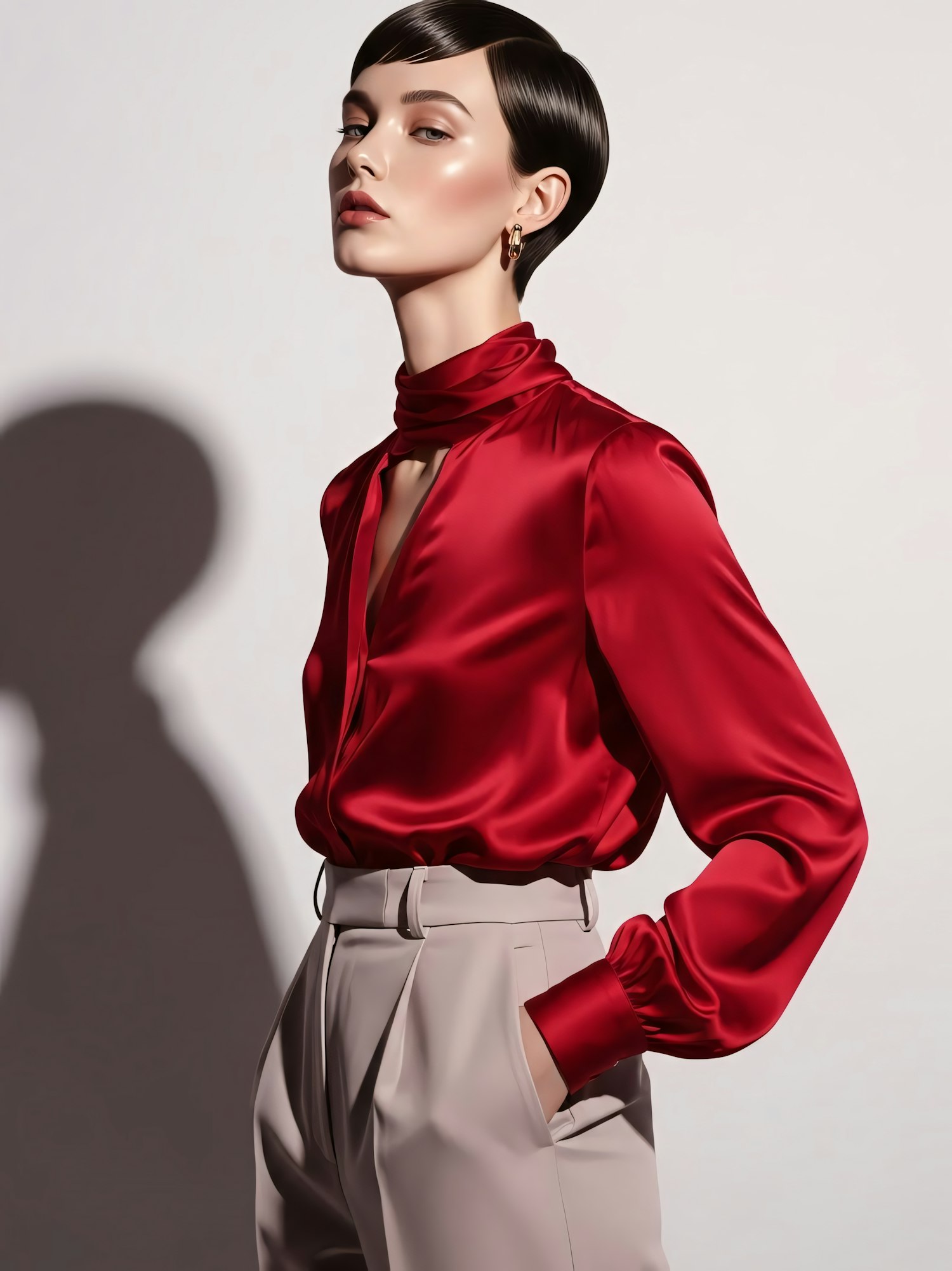 Stylish individual in a red satin blouse and beige trousers, showcasing modern elegance with sleek hair and gold accessories.