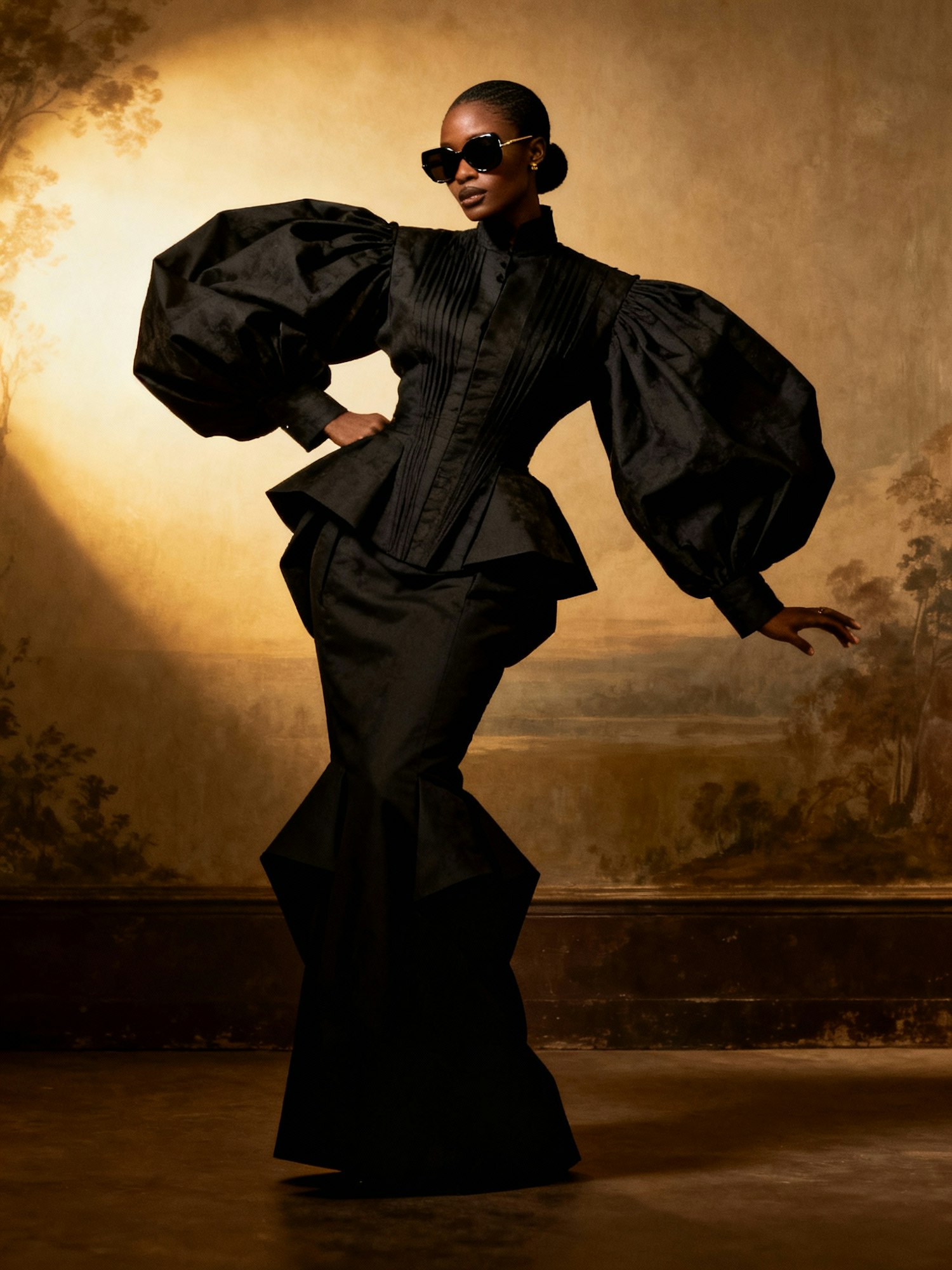 A stylish individual in a dramatic black outfit with puffed sleeves and sunglasses, set against a warm, artistic background.