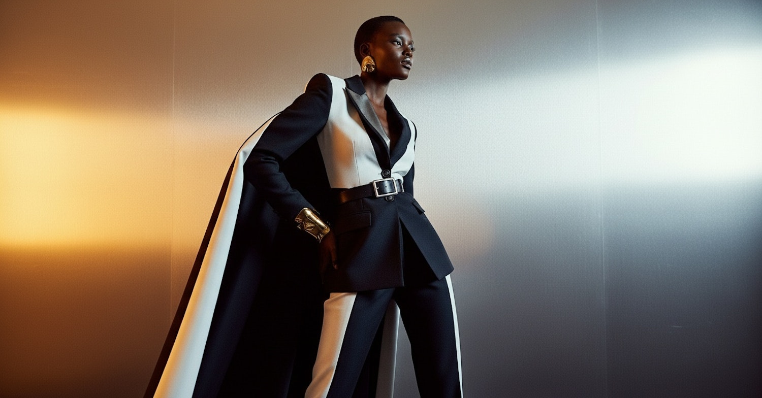 A person in a tailored black and white suit with gold accessories, posing confidently against a gradient-lit background.
