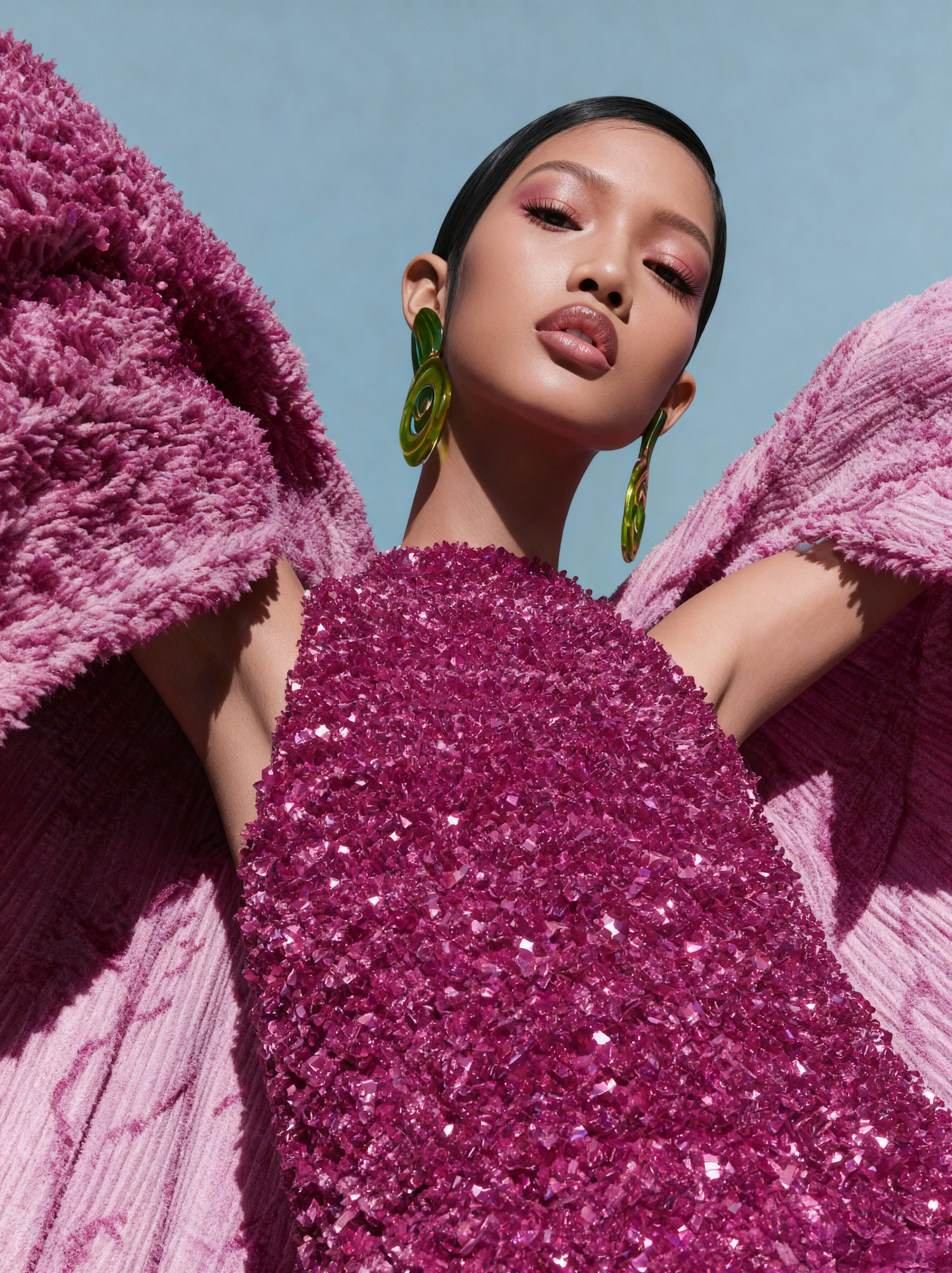 A model in a magenta textured outfit with green earrings poses against a blue background, showcasing bold fashion and vibrant colors.
