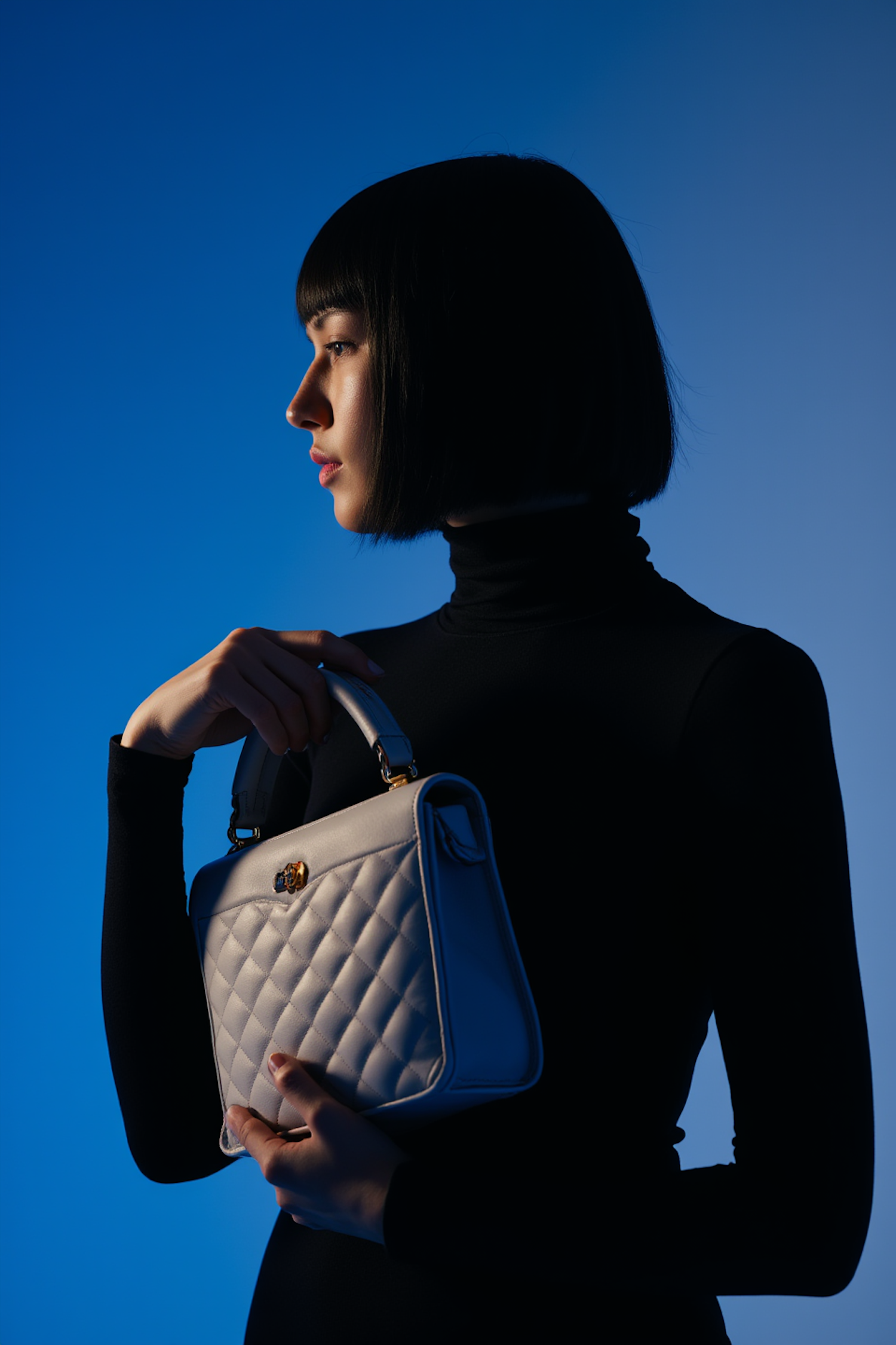 Stylish woman in black turtleneck holding a white quilted handbag against a blue gradient background, showcasing elegance and fashion.