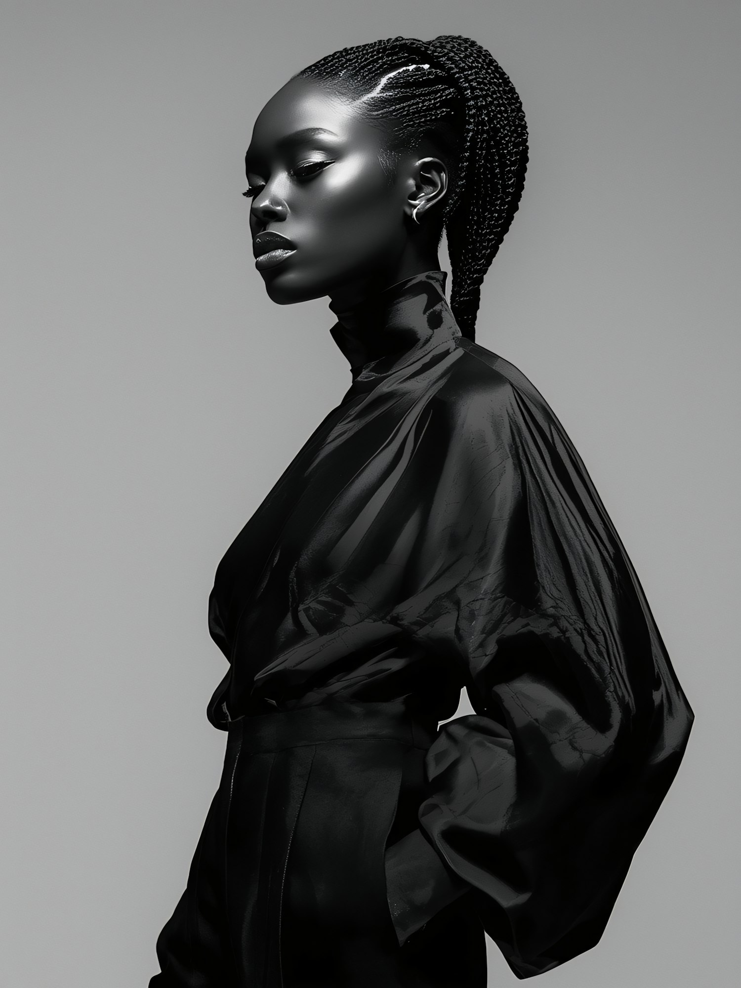 A stunning portrait of a woman in a sleek black outfit with braided hair, showcasing elegance and modern style against a neutral background.