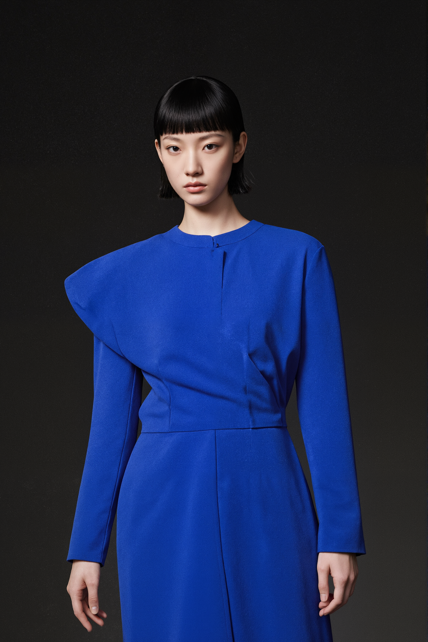 Asian woman in a royal blue asymmetrical dress against a dark background, showcasing modern fashion style.