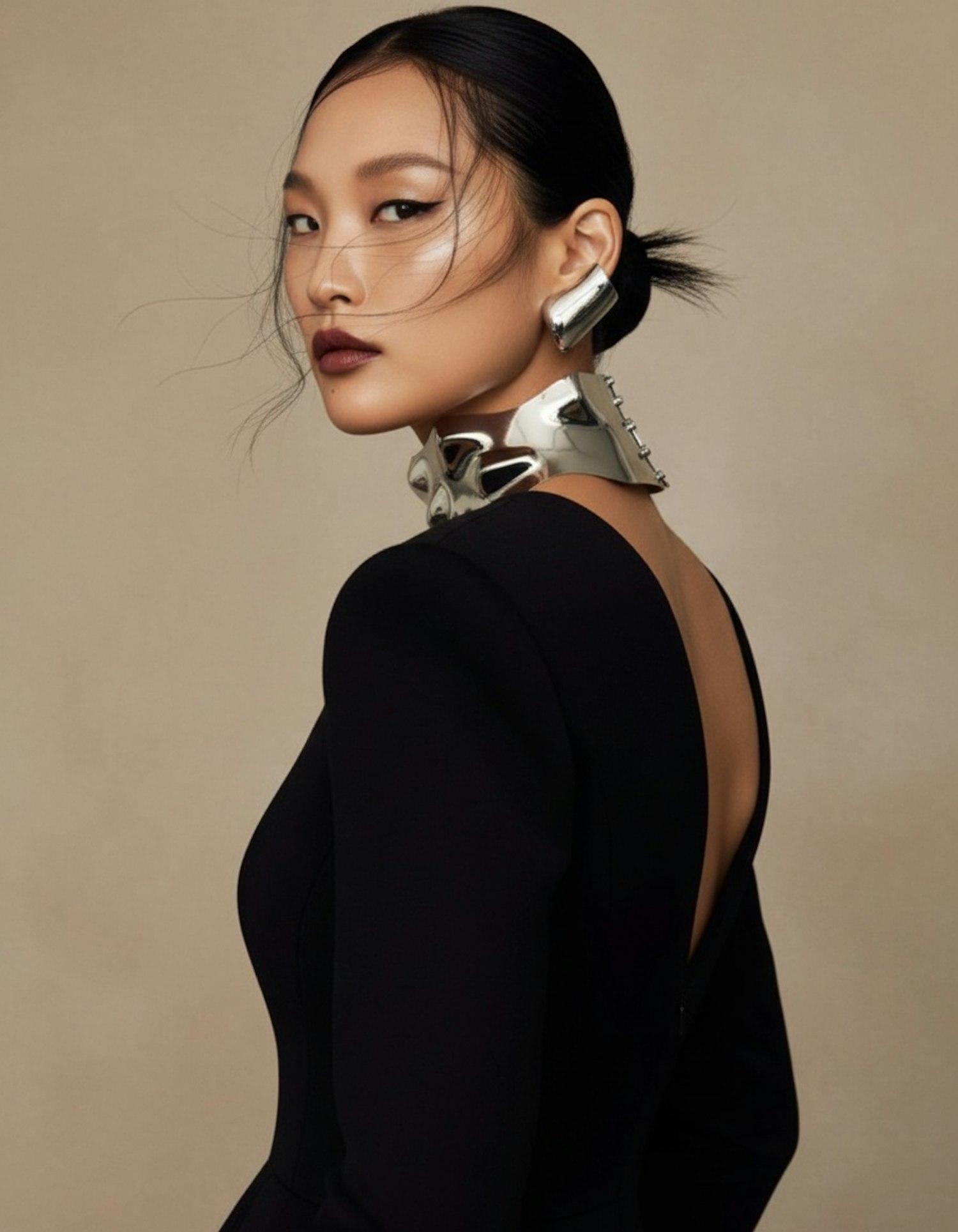 A stylish woman in a black outfit with metallic accessories and dramatic makeup poses against a neutral background.