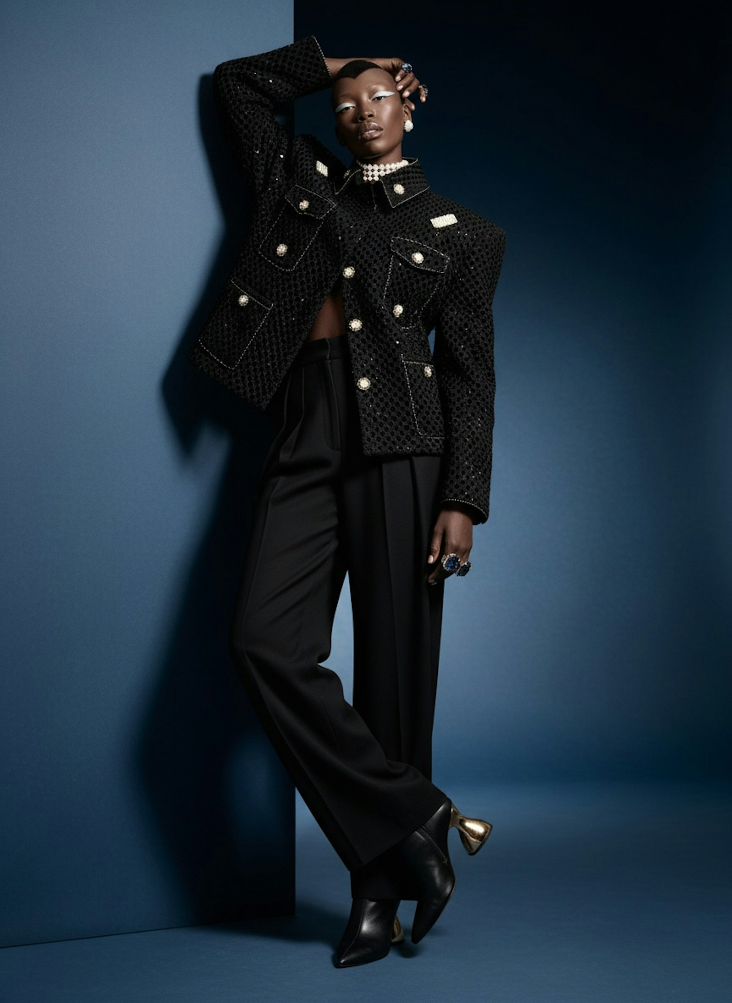 A stylish individual poses in a textured black jacket, tailored trousers, and unique boots, set against a blue background.