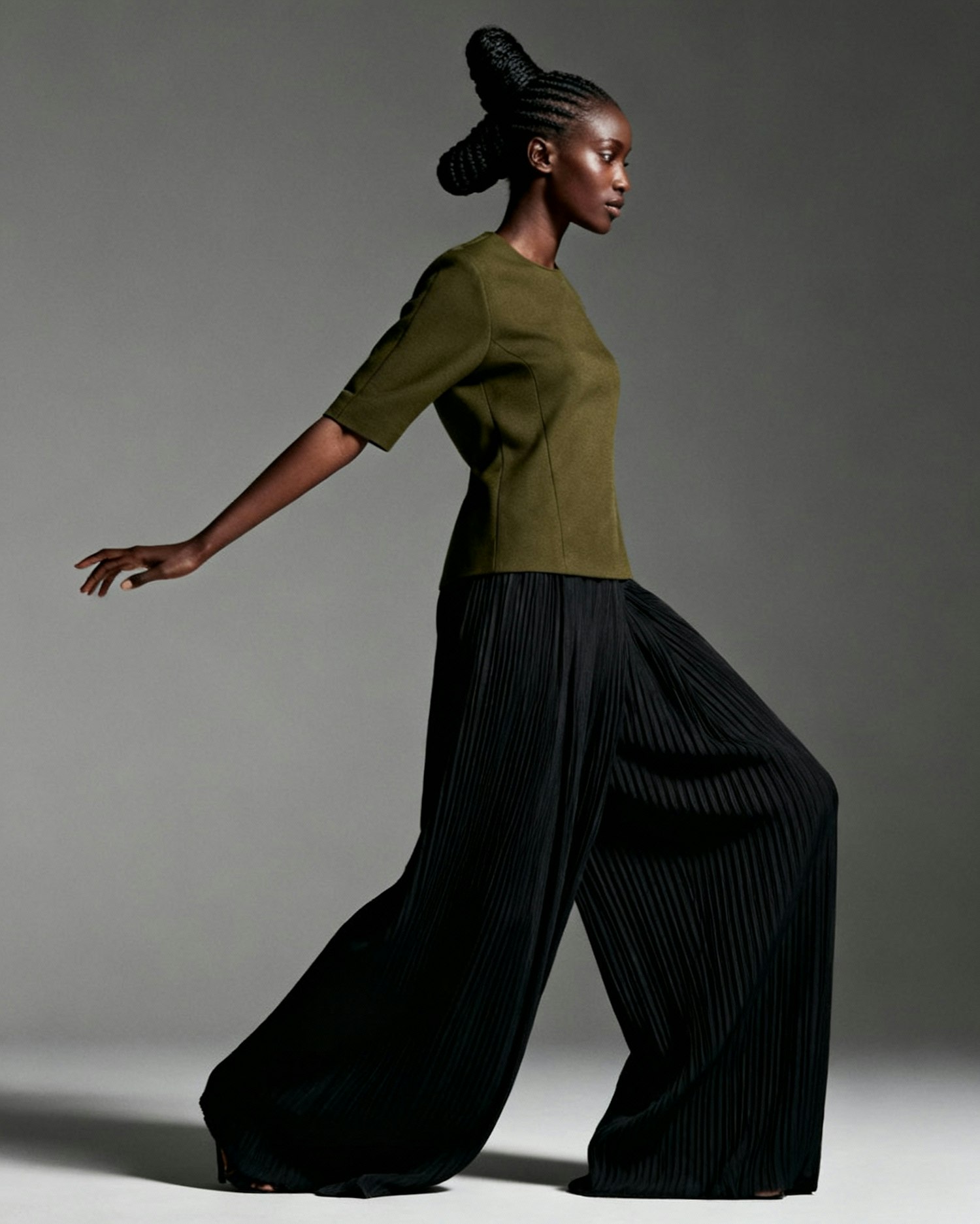 A stylish woman in an olive-green top and black pleated pants poses gracefully against a neutral gray background.