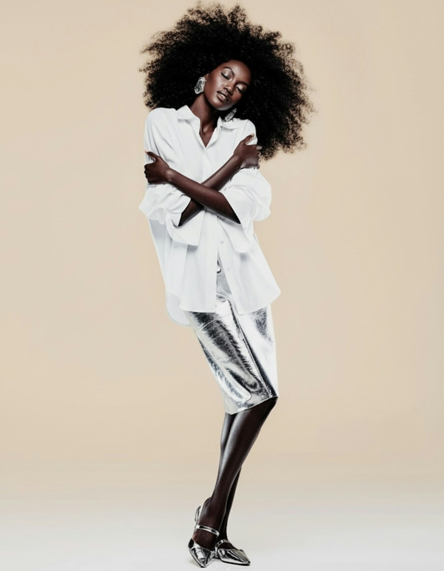 A fashionable person poses in a white shirt and metallic silver skirt, exuding elegance and style against a neutral background.