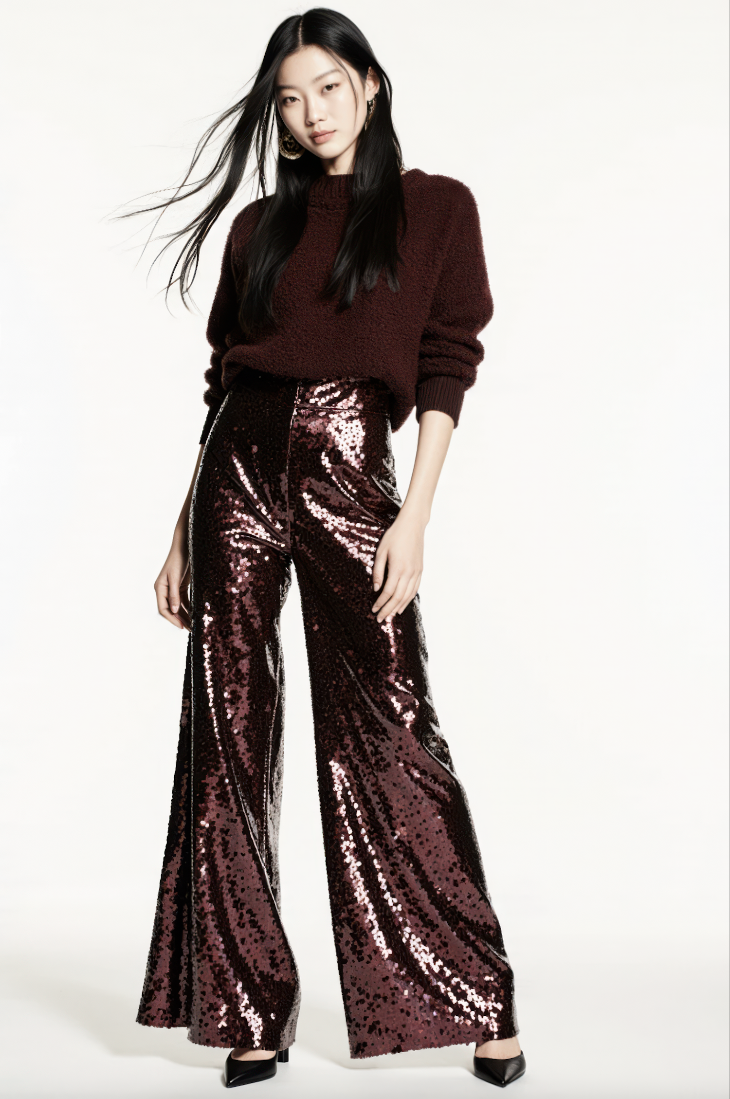 Stylish woman in a burgundy sweater and sequined pants, posing confidently against a white background.