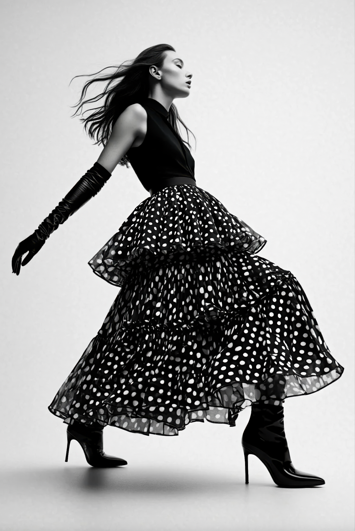Chic monochrome fashion with a polka-dot skirt, sleek gloves, and high-heeled boots, captured in a dynamic and stylish pose.